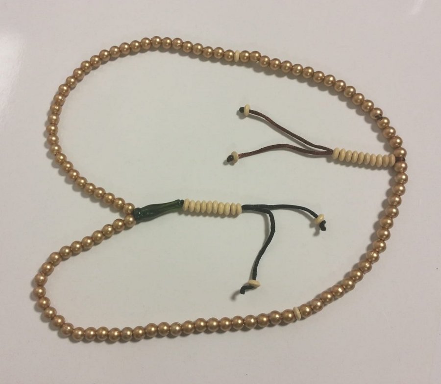 Chapelet doré (Sabha) 99 perles dorées avec 2 séparateurs et 2 pompons-compteurs blancs - REF. 40340 (6.90 €)
