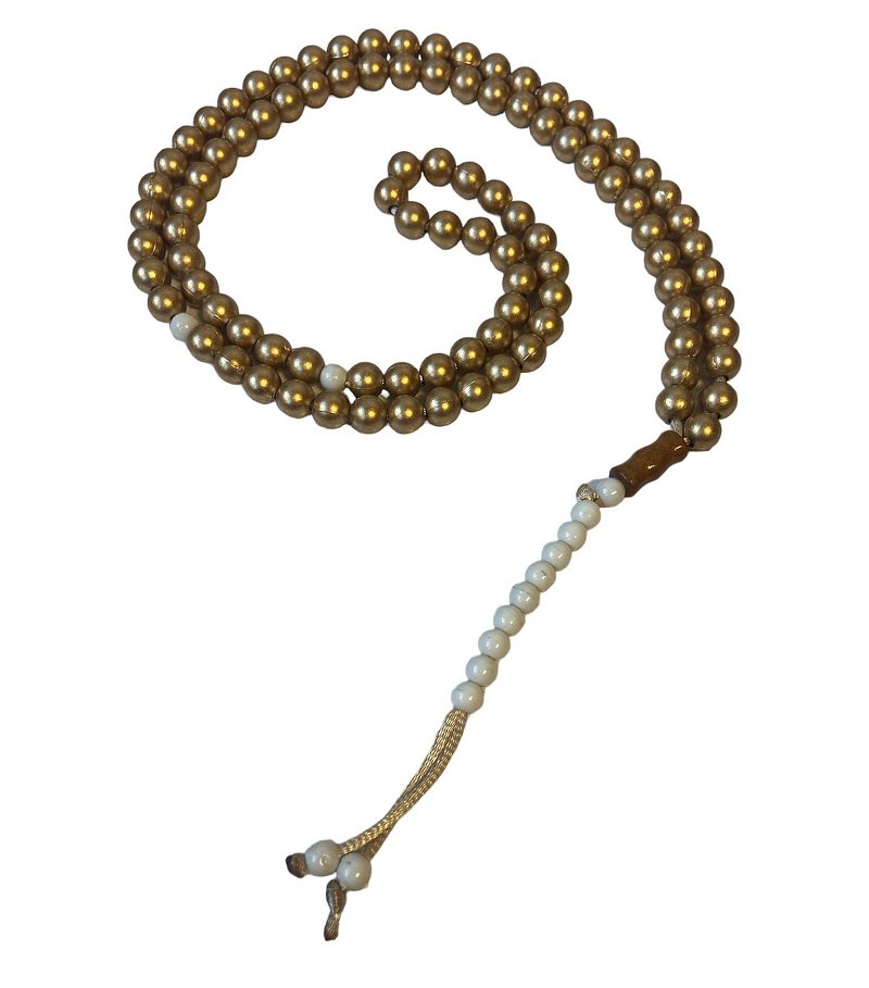 Chapelet doré (Sabha) 99 perles dorées avec 2 séparateurs et 2 pompons-compteurs blancs - REF. 40340 (6.90 €)