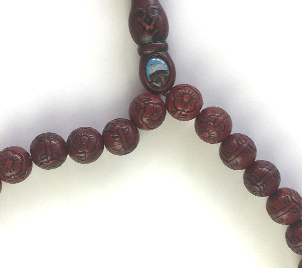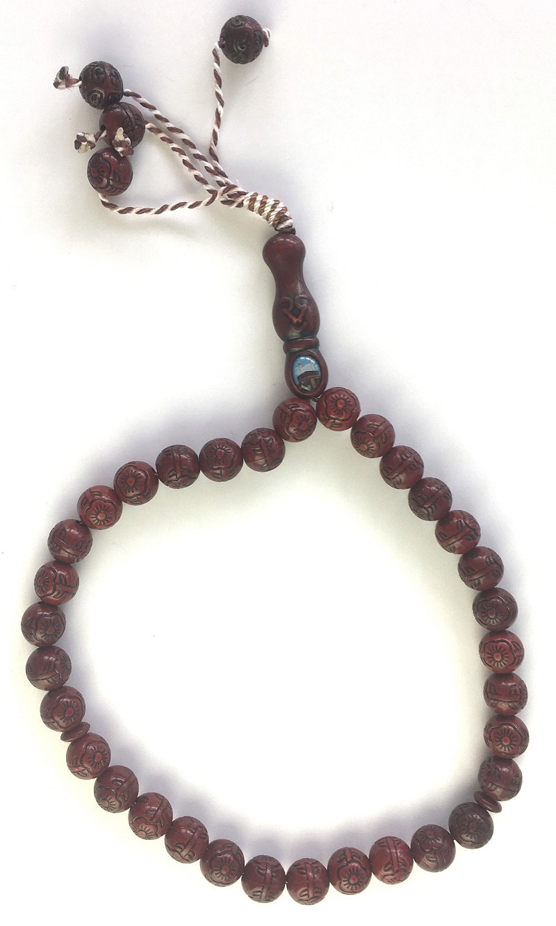 Chapelet musulman (tasbîh) à 33 grains de couleur marron avec lucarne vue sur La Kaaba (La Mecque). Séparateur toutes les 11 perles.