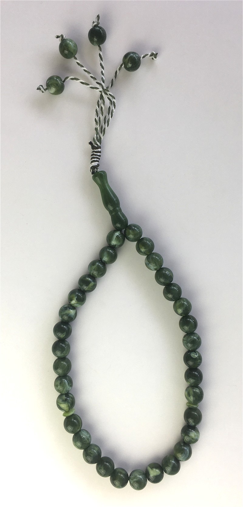 Chapelet islamique (Sabhat) à 33 perles de couleur vert foncé marbré. Avec séparateur toutes les 11 perles.