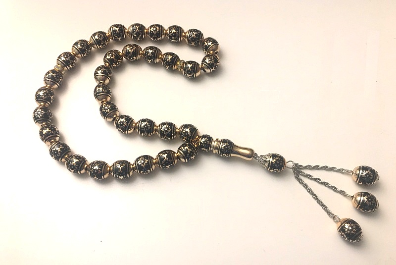 Beau chapelet doré avec des motifs noirs. Il contient 33 grains plus quelques-uns en extrémité qui servent de décoration.