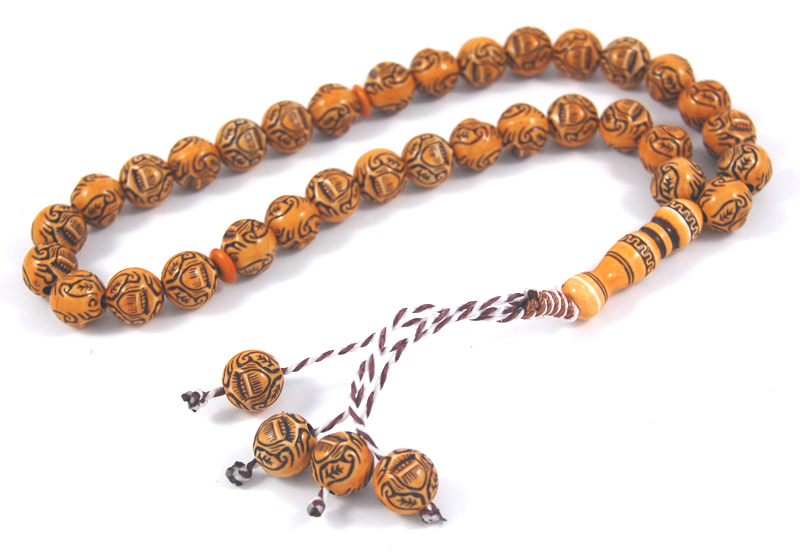 Chapelet (sebha - soubha) 33 grains en plastique de couleur marron clair, avec une décoration sur chaque grain en noir.