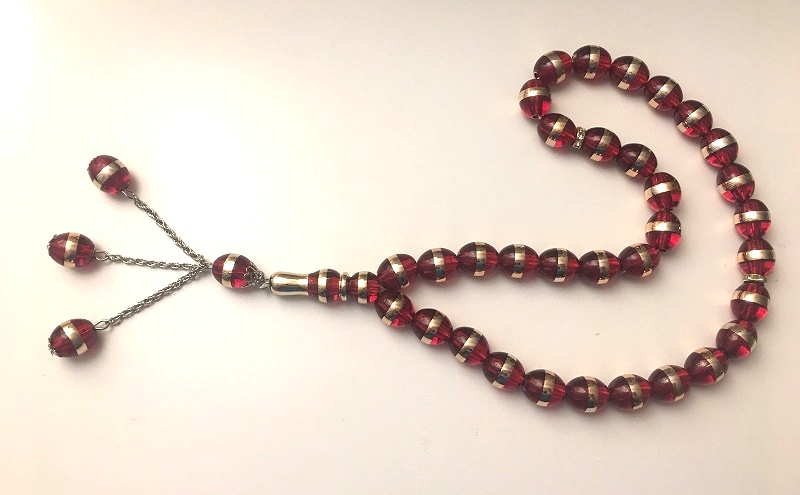 Beau chapelet rouge avec des bandes dorées. Il contient 33 grains plus quelques-uns en extrémité qui servent de décoration.