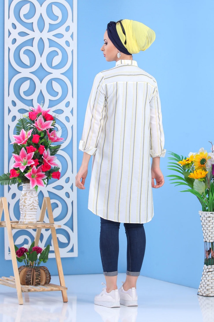 Chemise longue blanche avec rayures couleur.