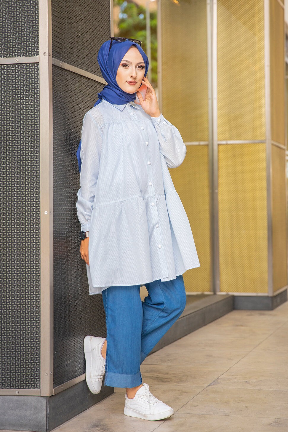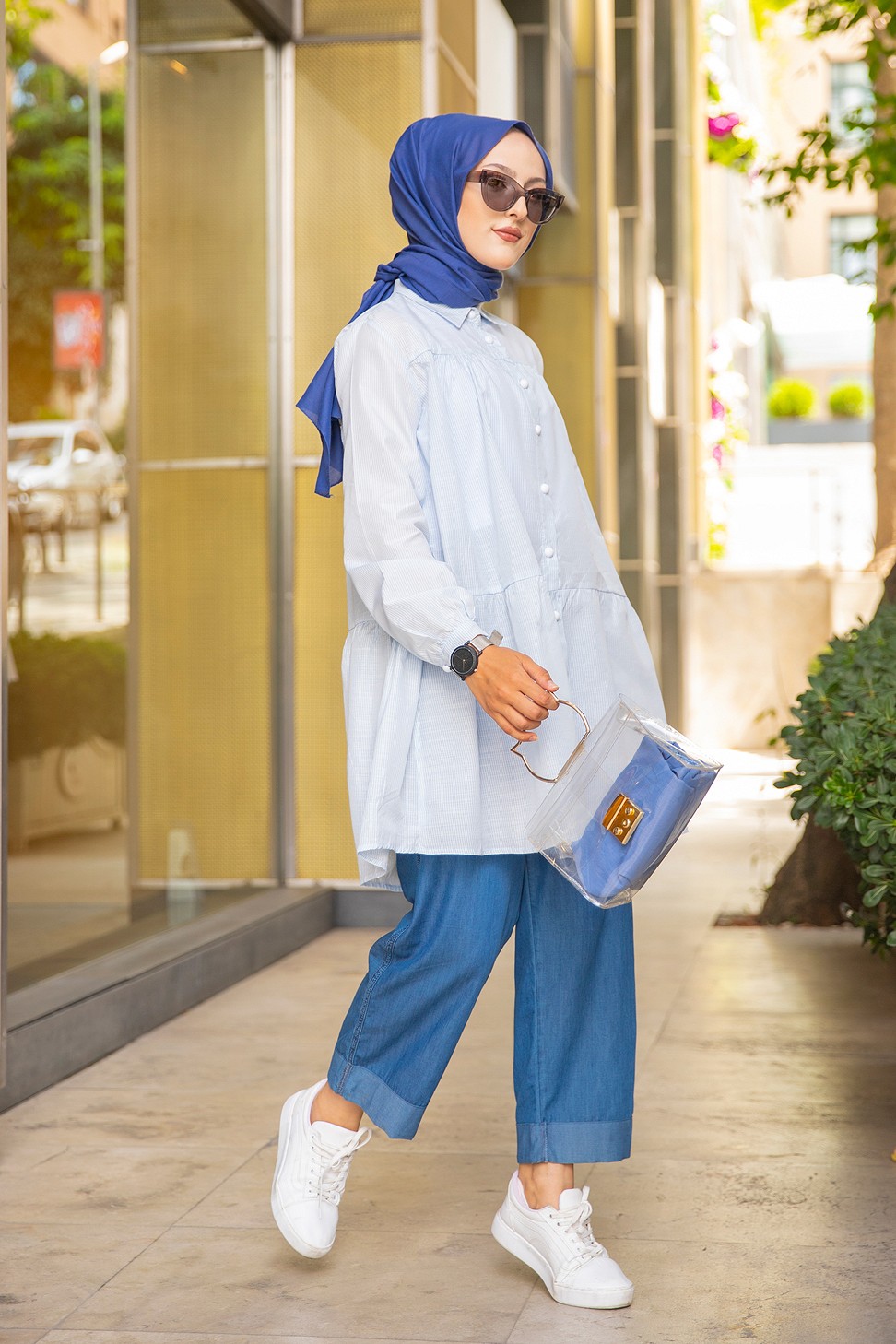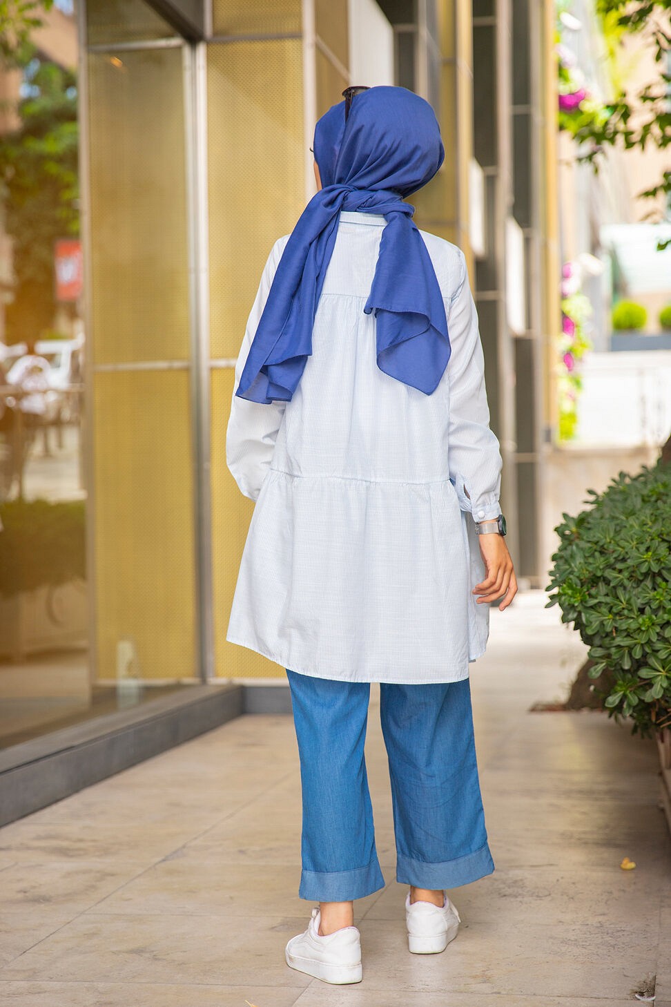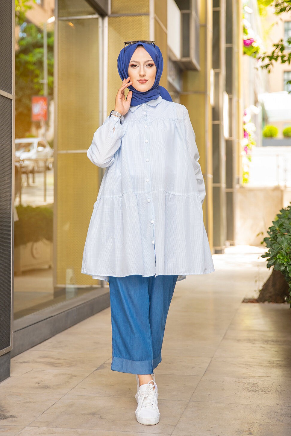 Chemise-Tunique casual ample a rayures bleu clair (Nouveaute Tenue Hijab pour femme voilee)