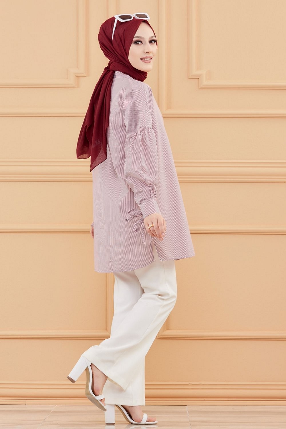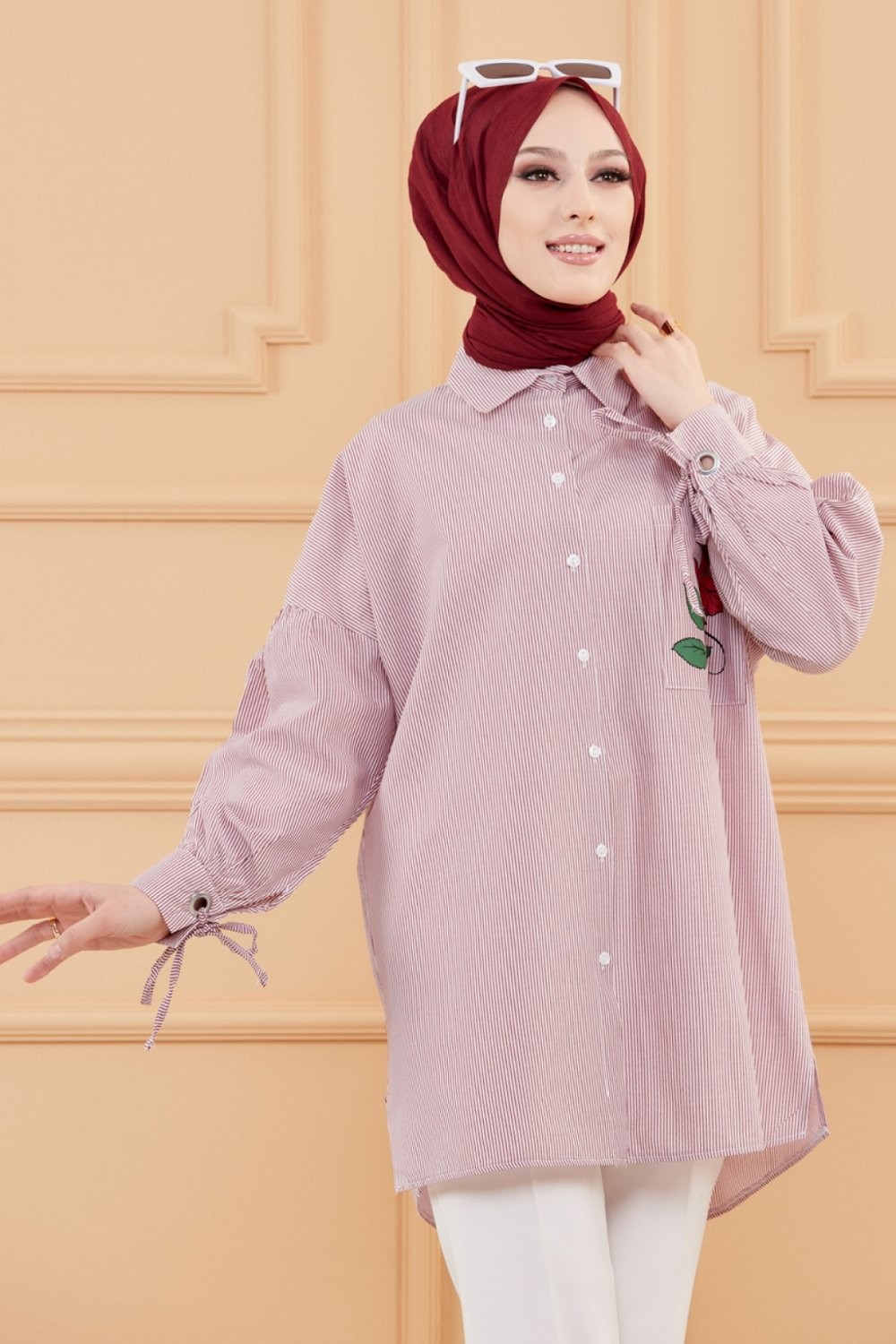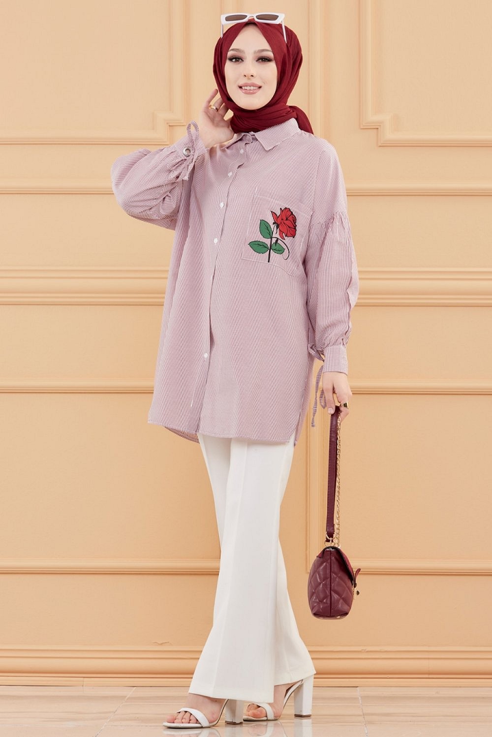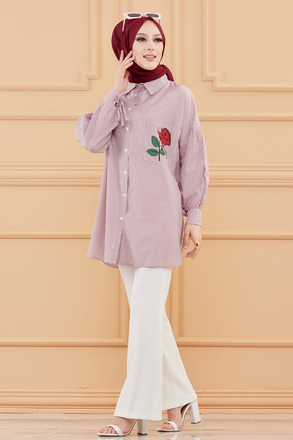 Chemise-Tunique motif fleur pour femme (Vetement Hijab) - Couleur des rayures : bordeaux