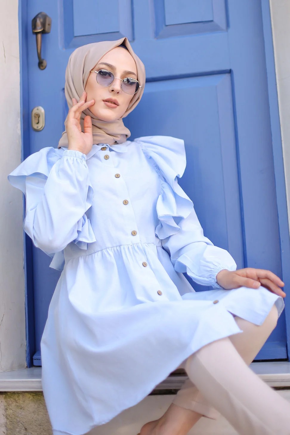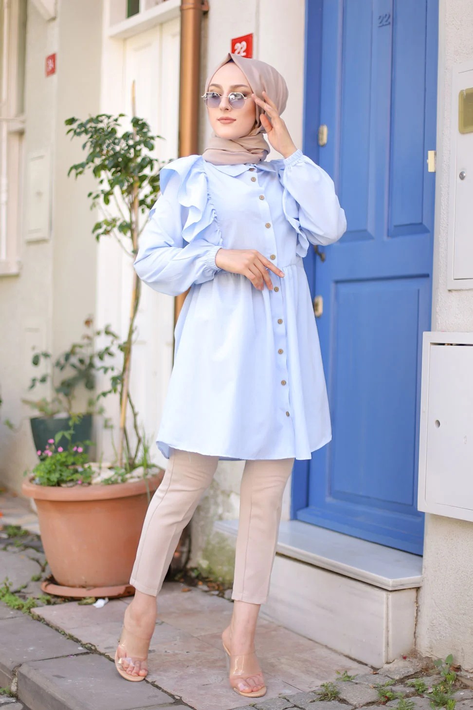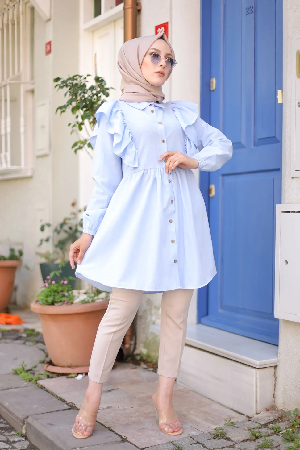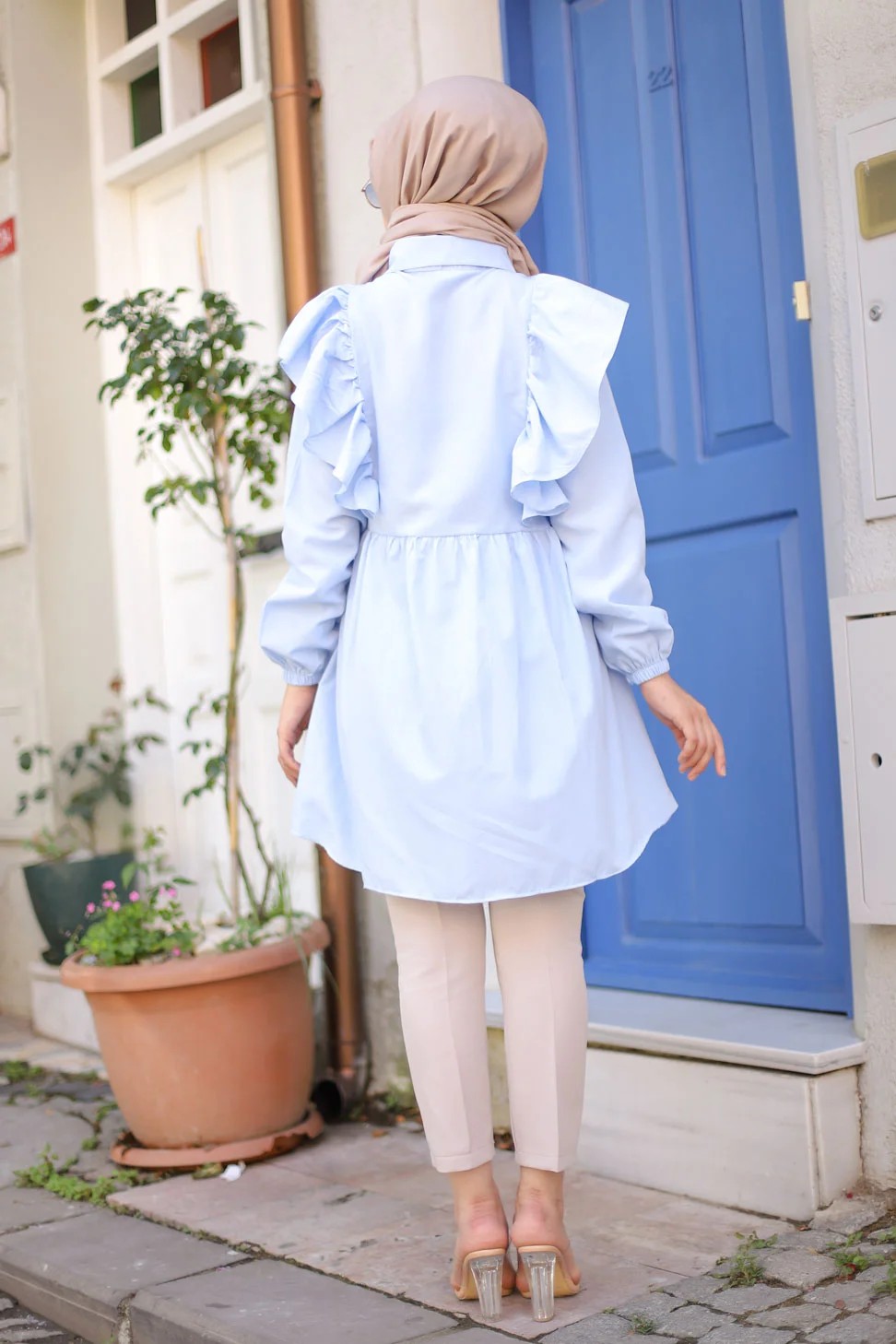Chemise a froufrou (Vetement femme voilee chic) - Couleur bleu ciel
