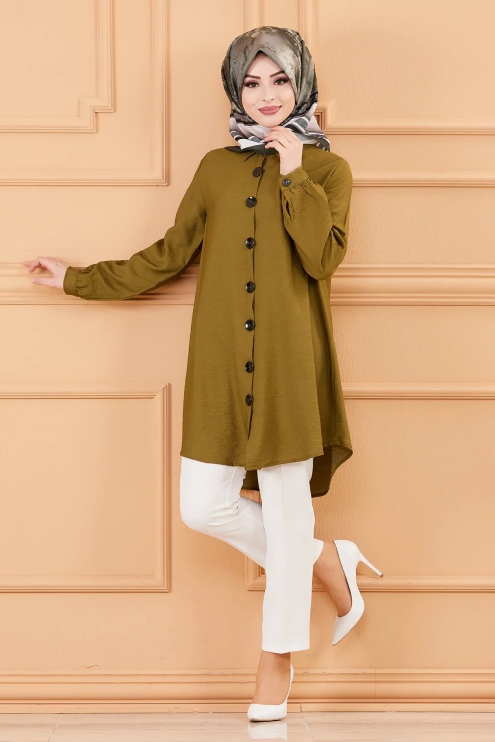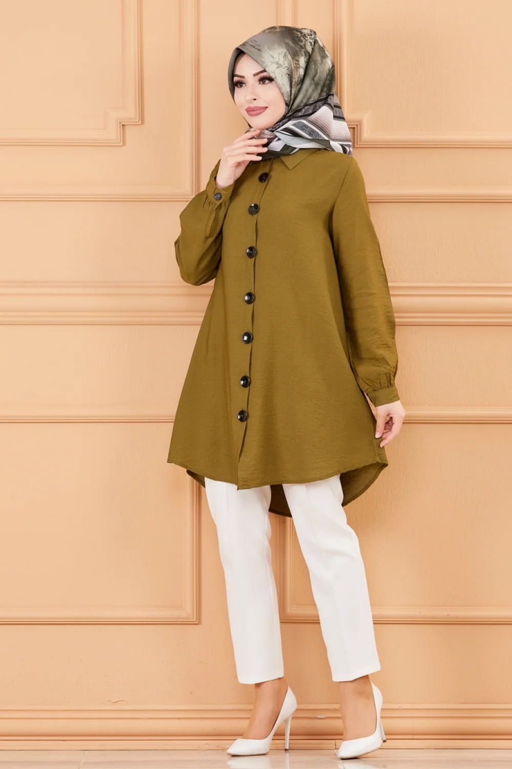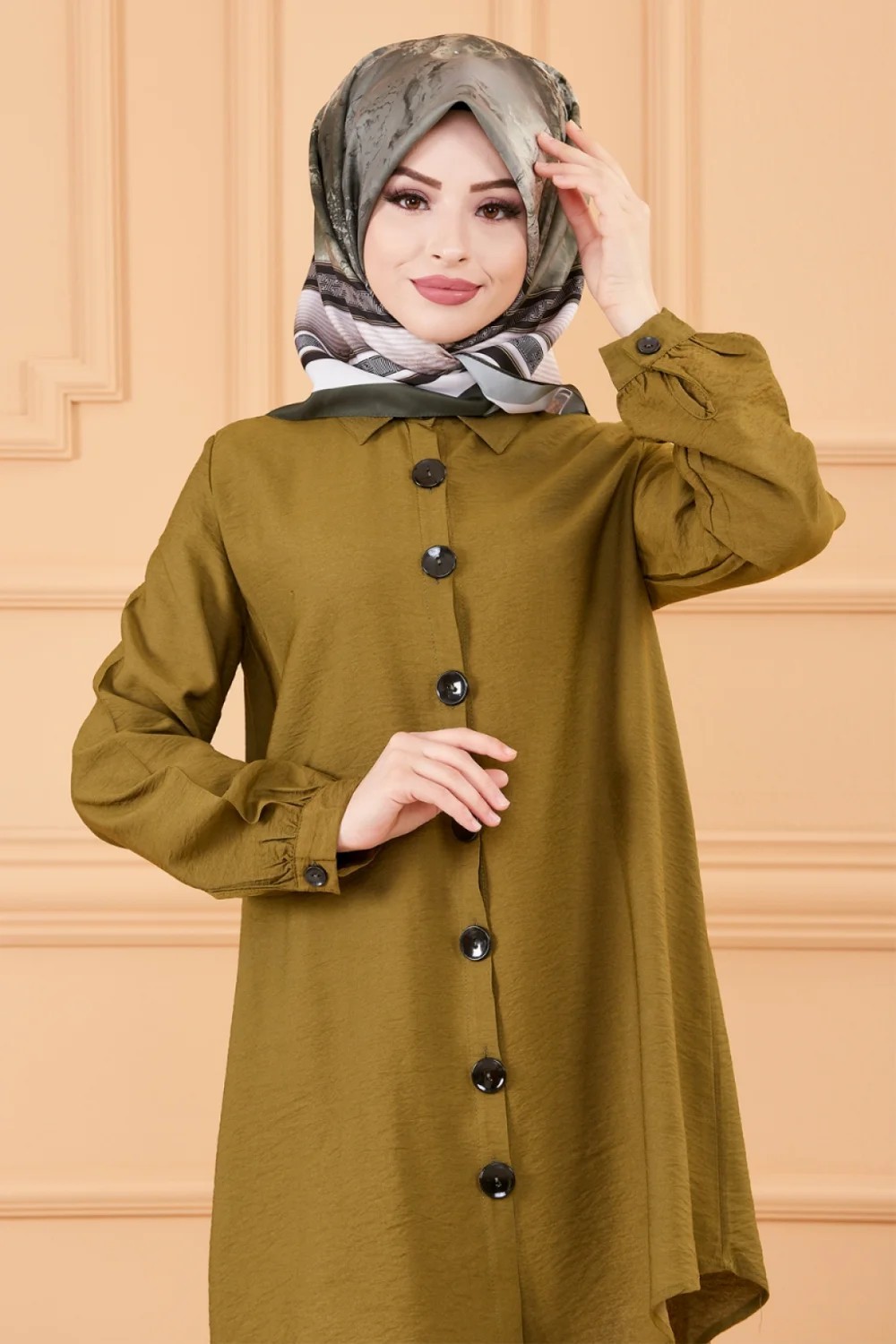 Chemise a gros boutons (Tunique style habille pour hijab) - Couleur kaki fonce