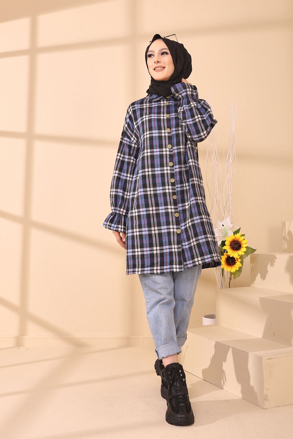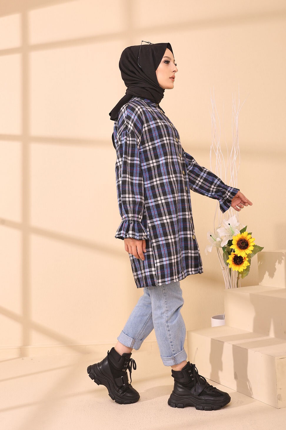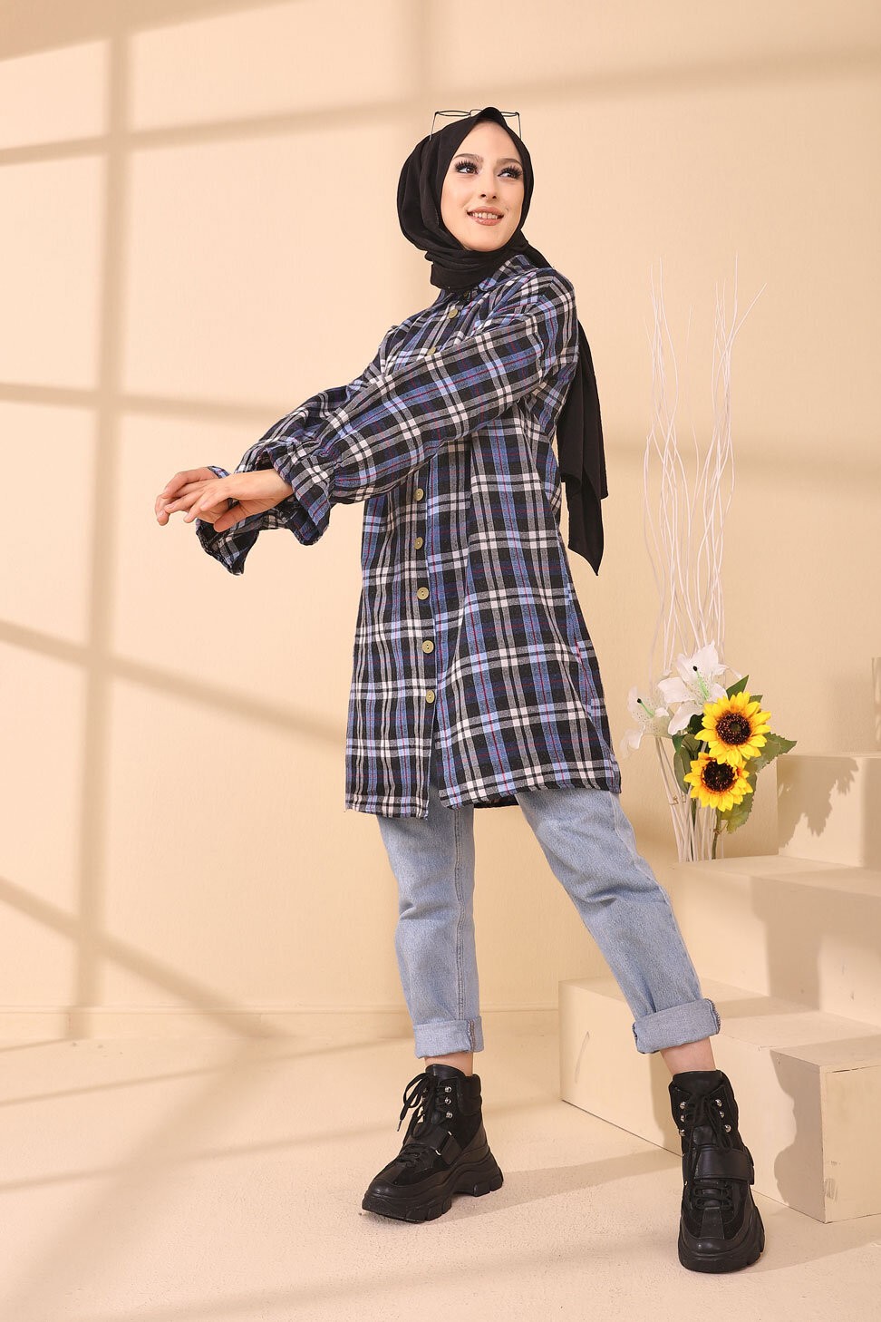 Chemise ample - Tunique à carreaux (Vêtement Hijab style 2025) - Rayures de couleur bleu Vetement & Accessoire