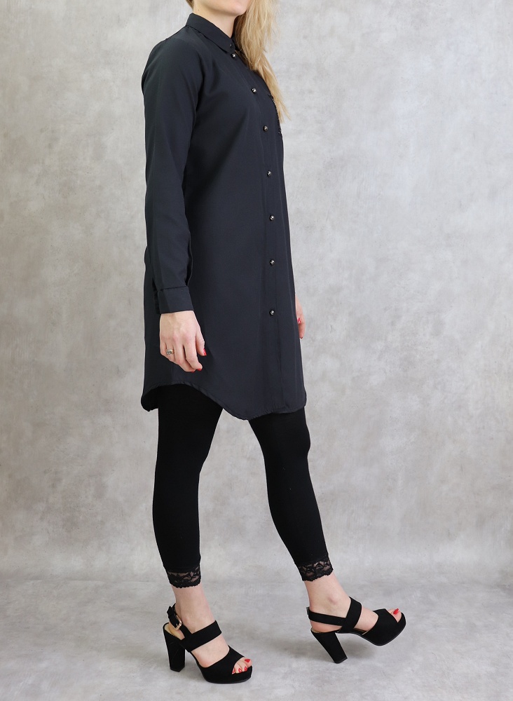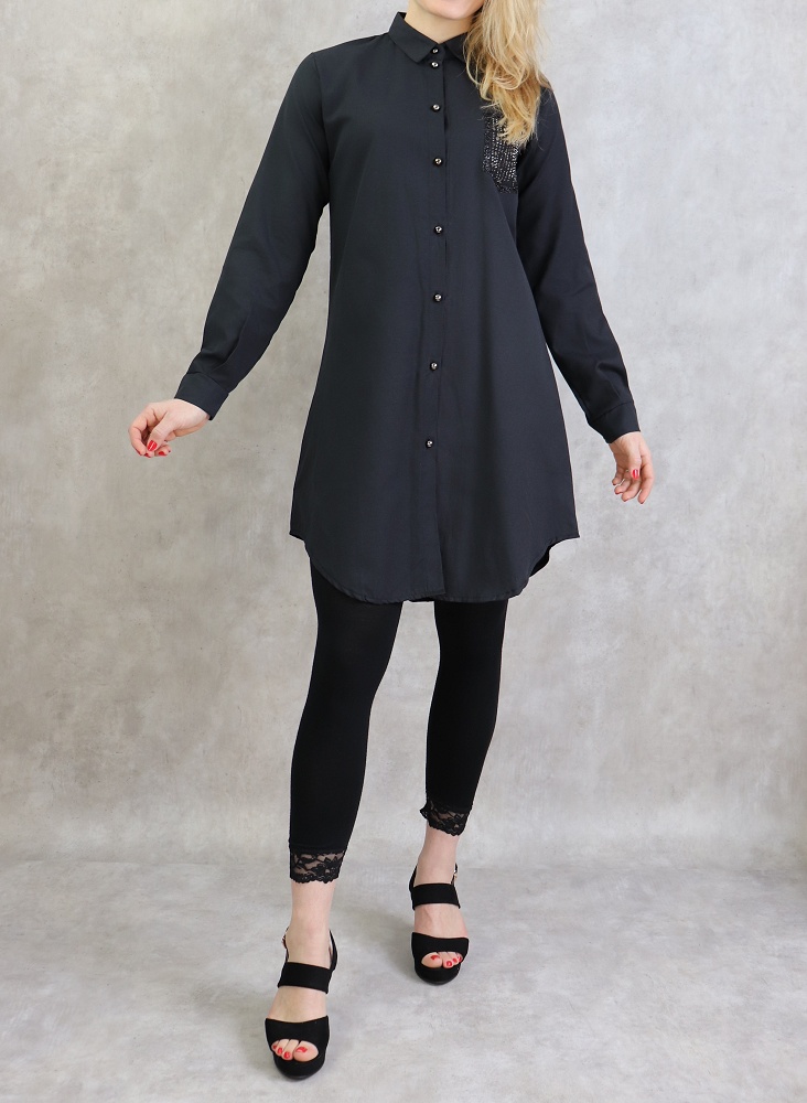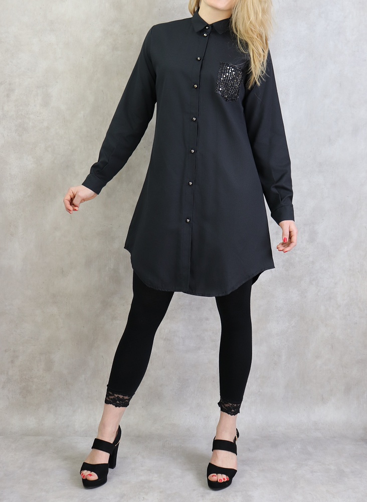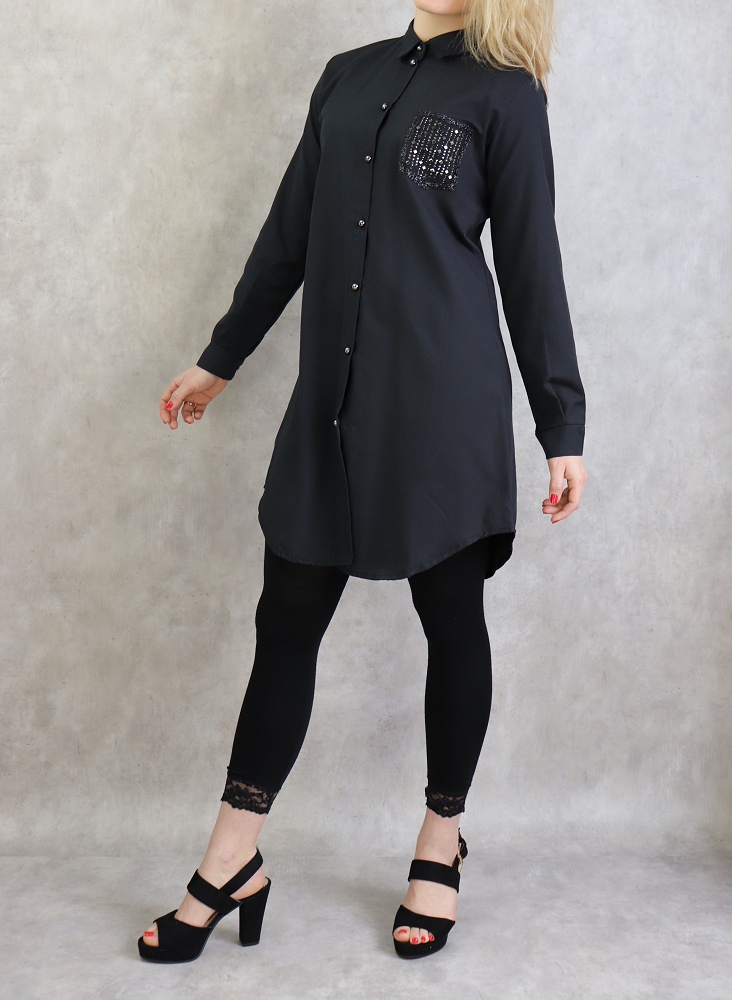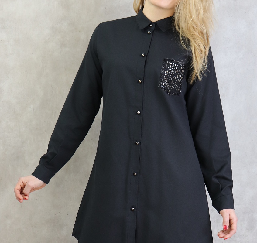Chemise longue, col chemise, manches finition bouton, imitation fausse poche strass et paillette sur un coté, fermeture boutons, coupe droite, tissu non transparent.