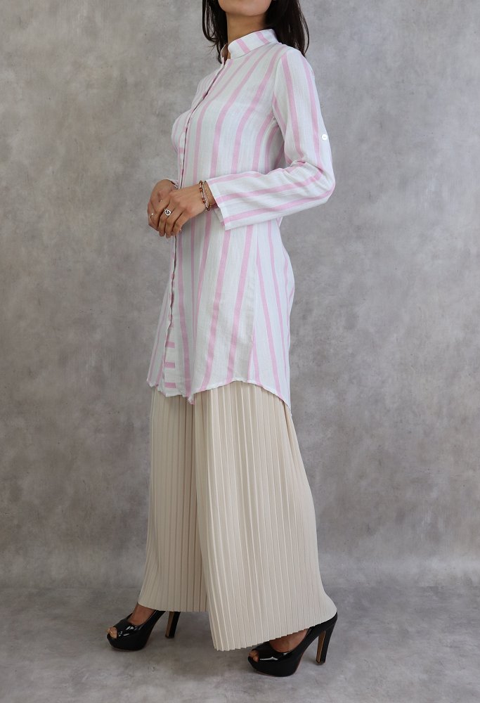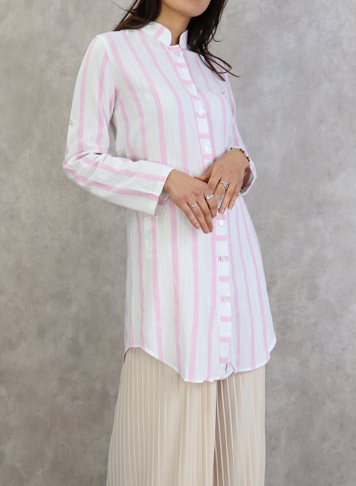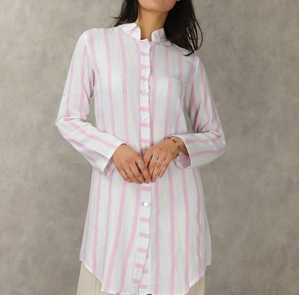 Chemise coton mi-longue a rayures de couleur Blanc et Rose