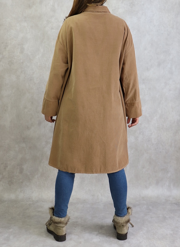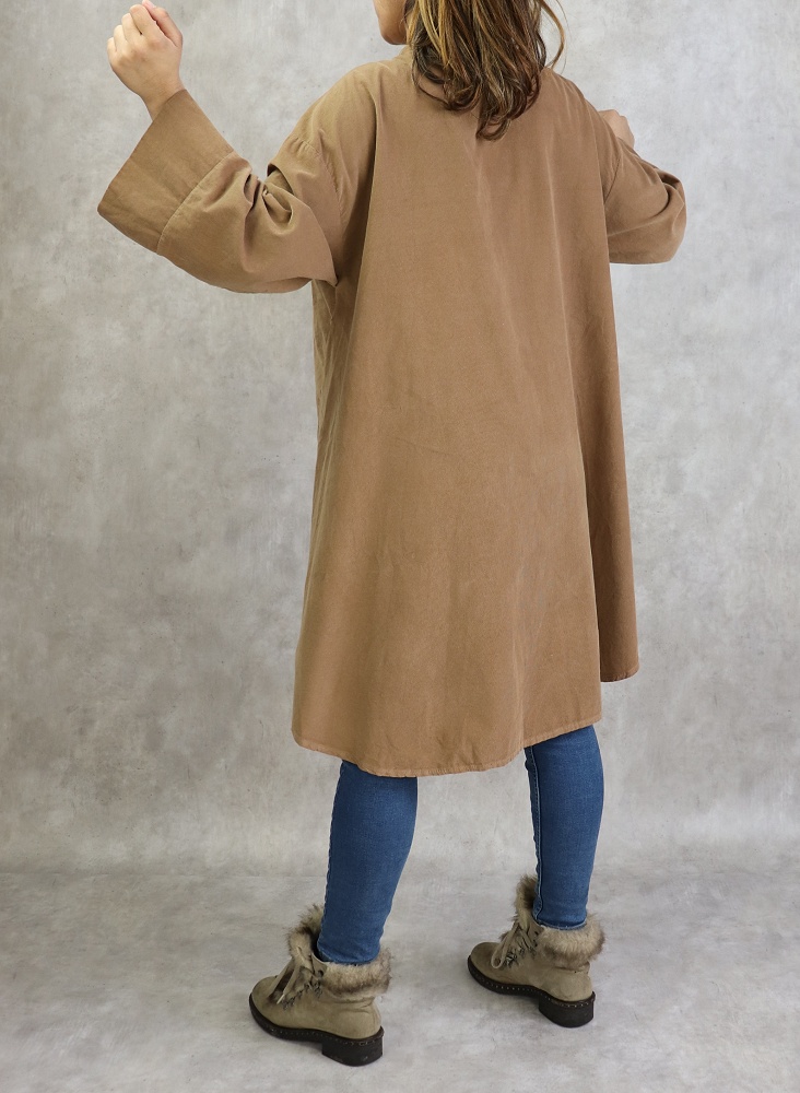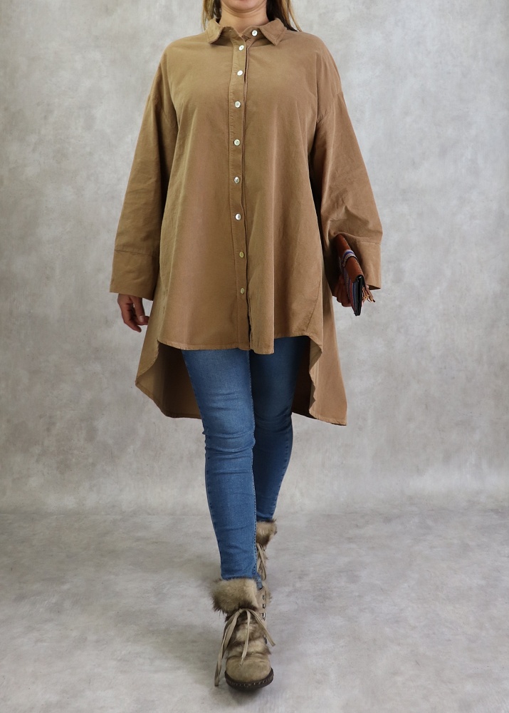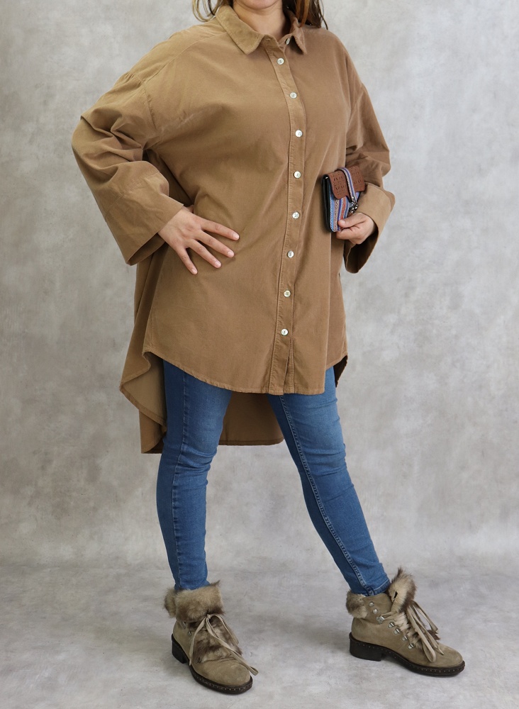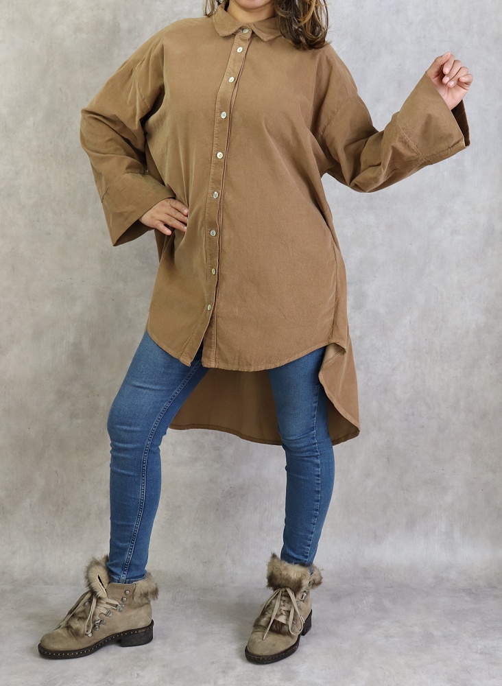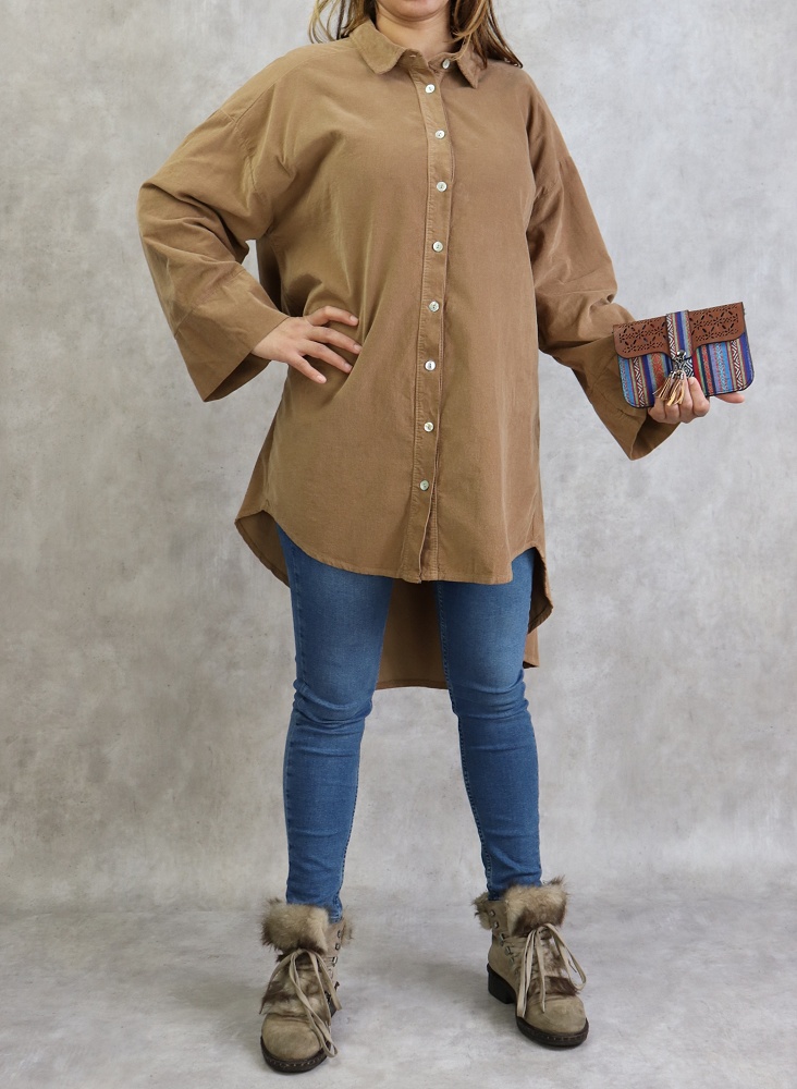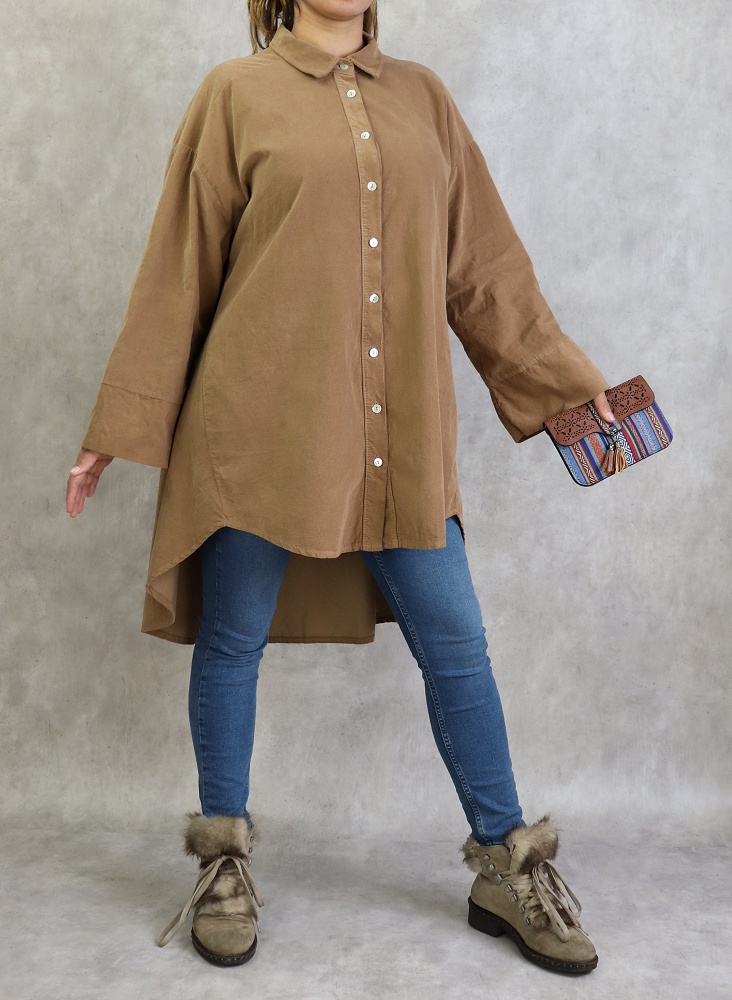 Chemise mi longue, manches amples, fermeture boutons, tissu effet velours côtelé fin, coupe large.