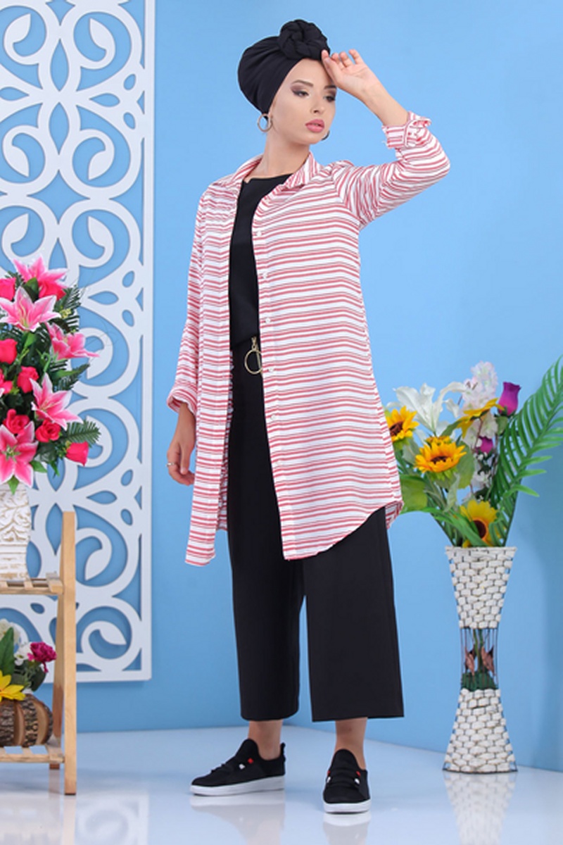 Tunique avec col foufrou (Vêtements femmes musulmanes style habillé) - Rayures couleur bordeaux - REF. 36602 (22.00 €)