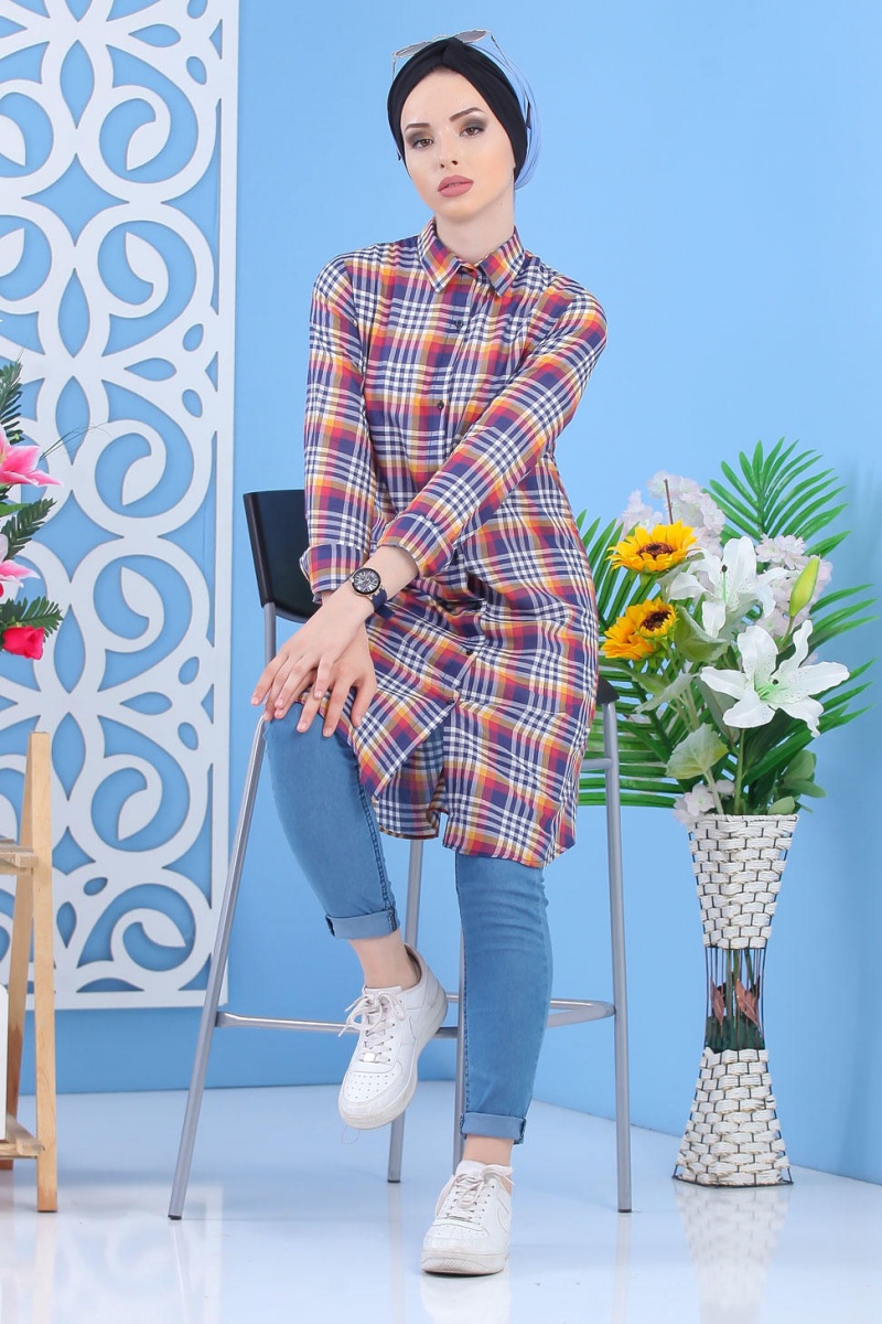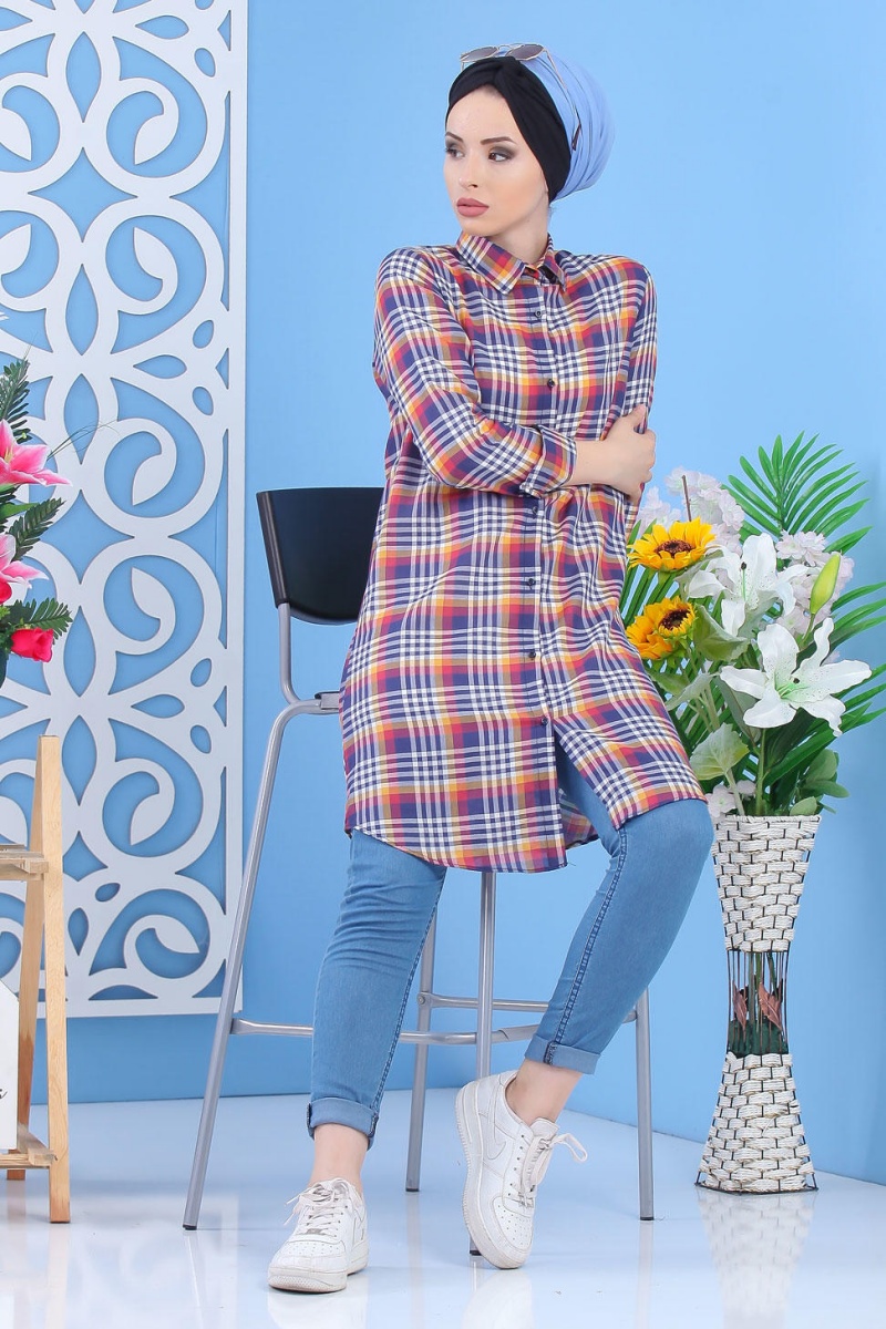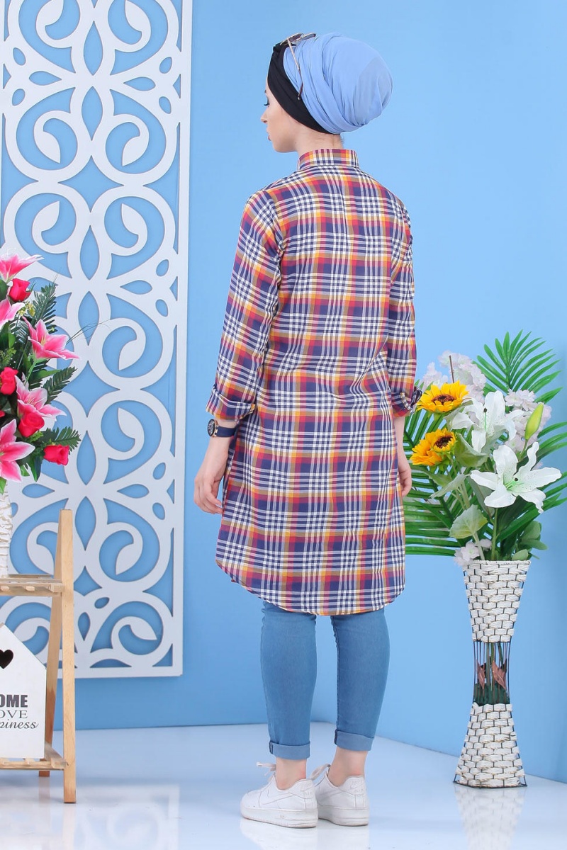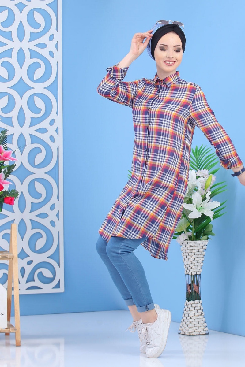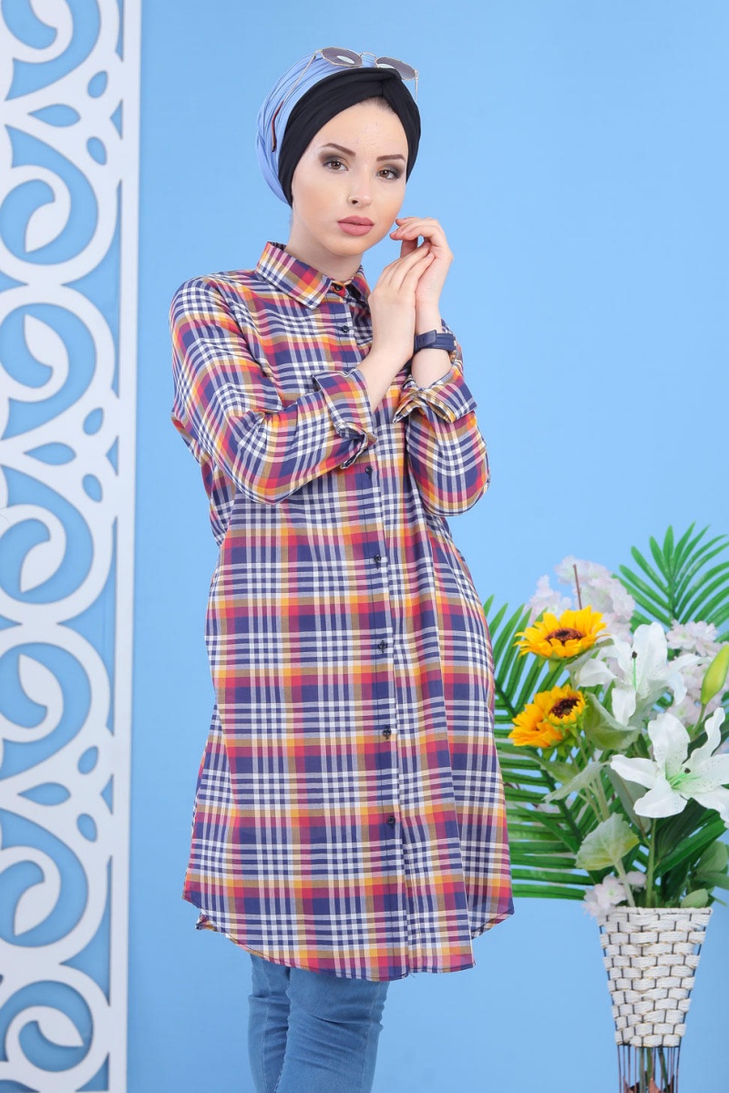Chemise longue à carreaux (Vêtement hijab boutique en ligne) - Couleur noir et kaki - REF. 38336 (24.90 €)