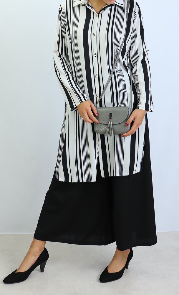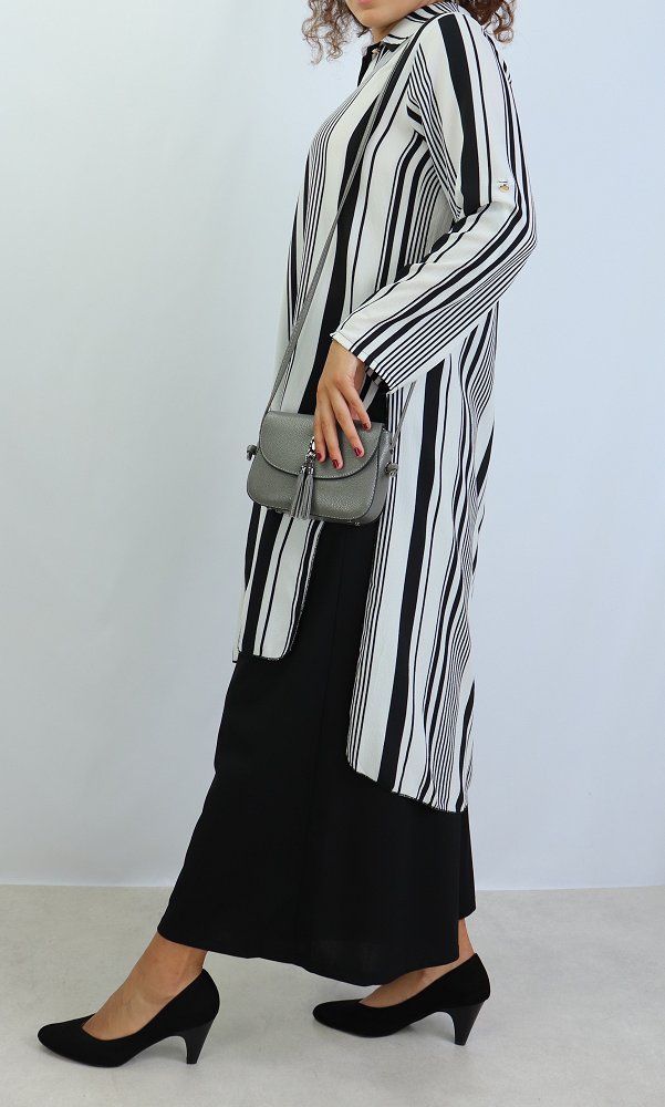Robe chemise imprimée à rayures (Vetement hijab femme voilée) - Couleur gris et blanc - REF. 32751 (29.90 €)