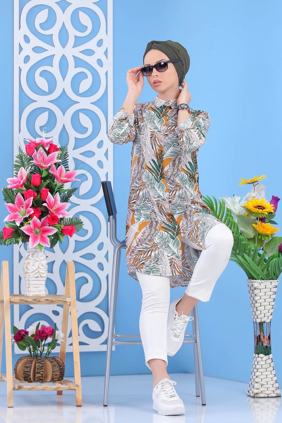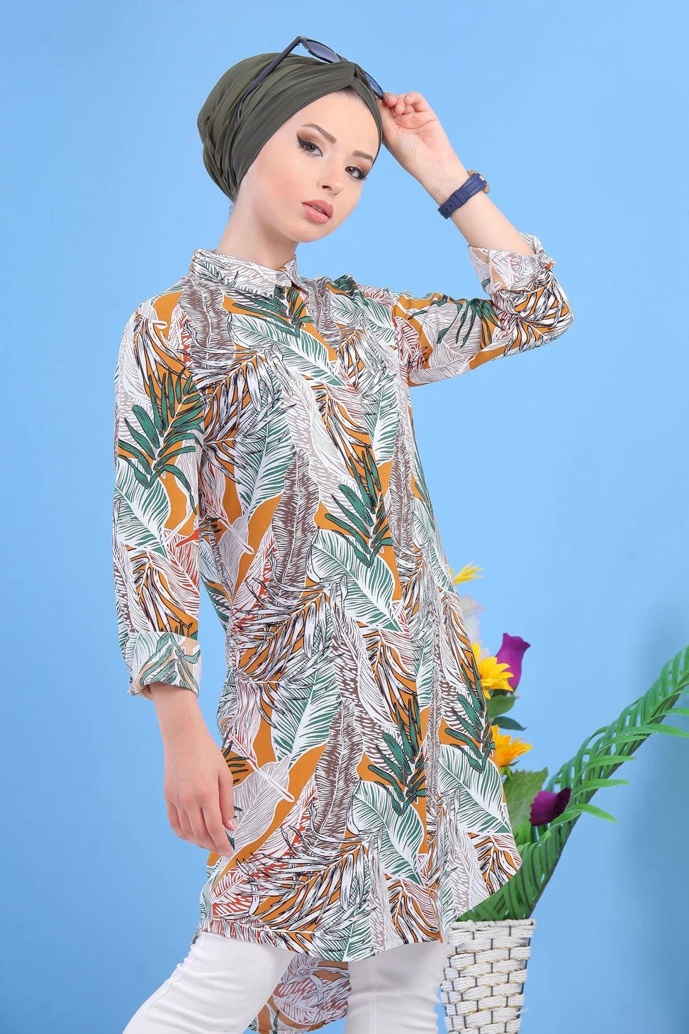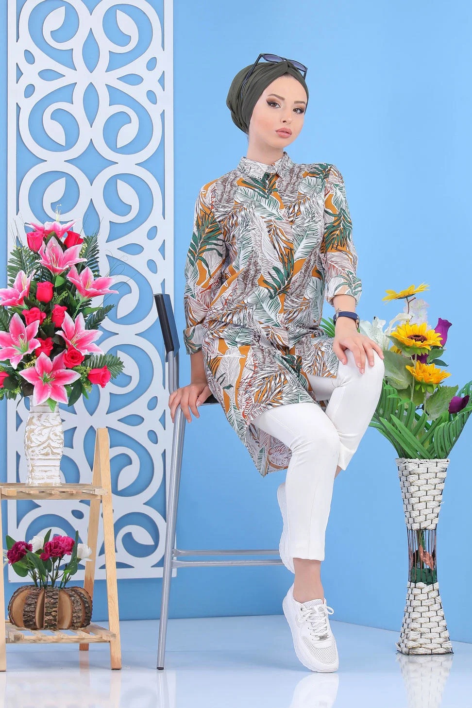 Chemise longue blanche pour femme 100% coton style décontracté à motifs tropical de couleur vert et jaune moutarde Vetement & Accessoire