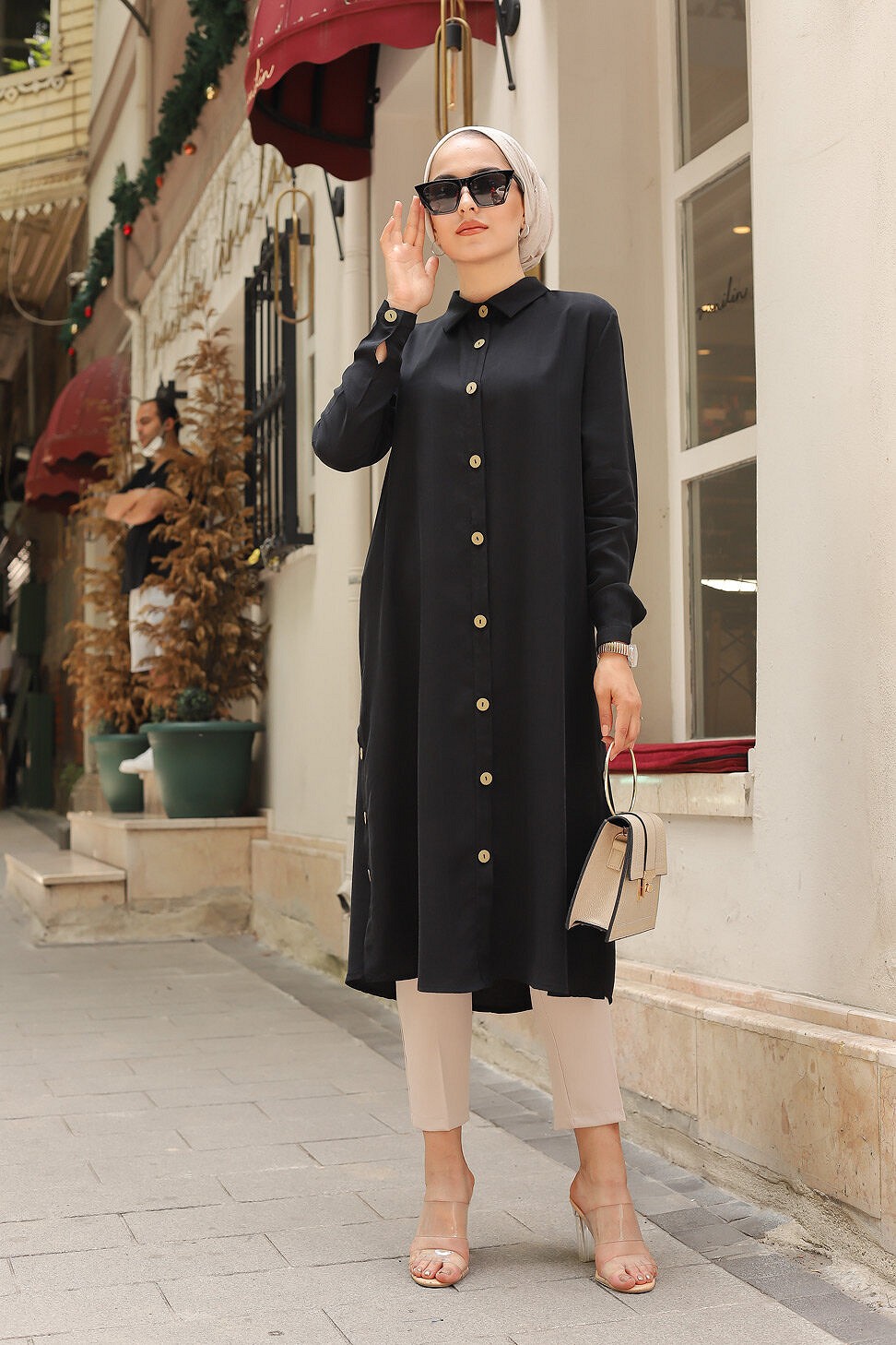 Robe-Chemise longue boutonnée avec ceinture de couleur noir (Vêtement moderne turque pour femme musulmane) - REF. 33360 (29.90 €)