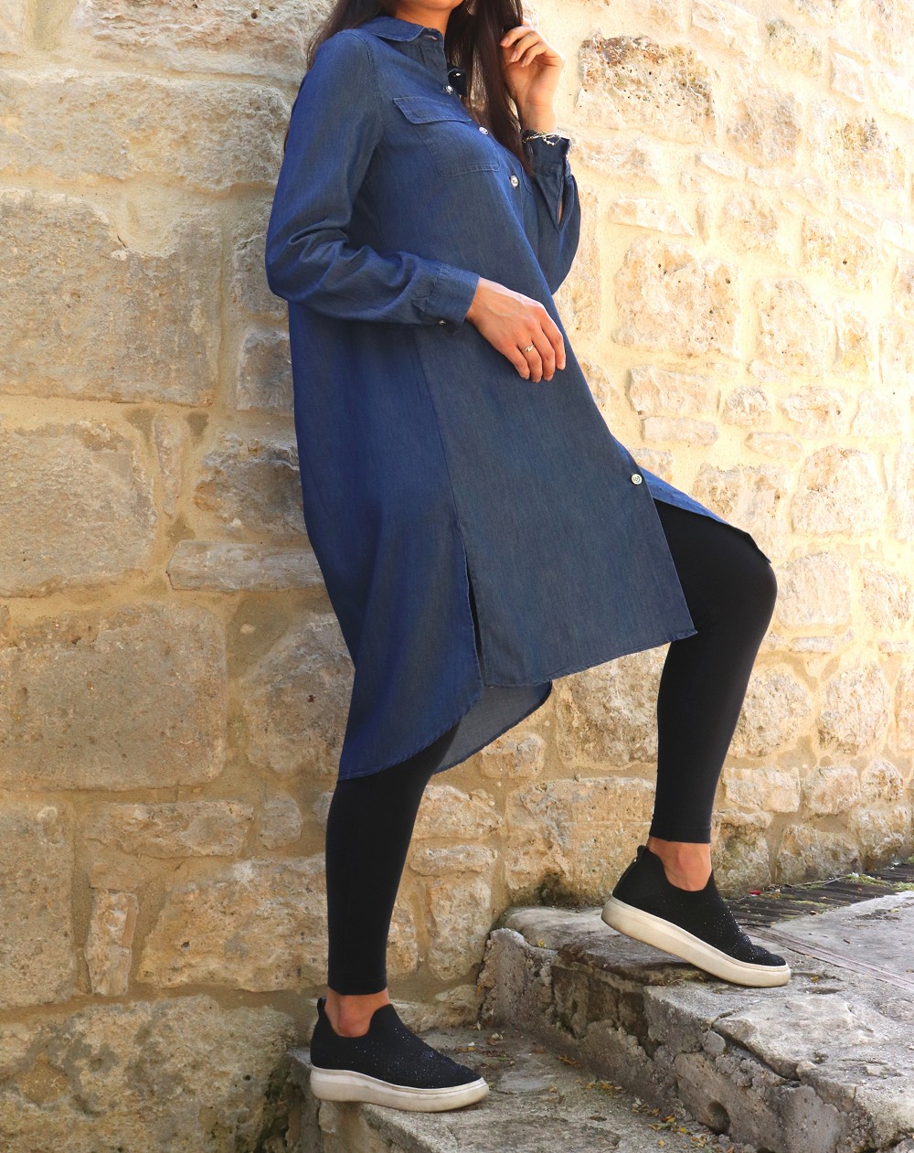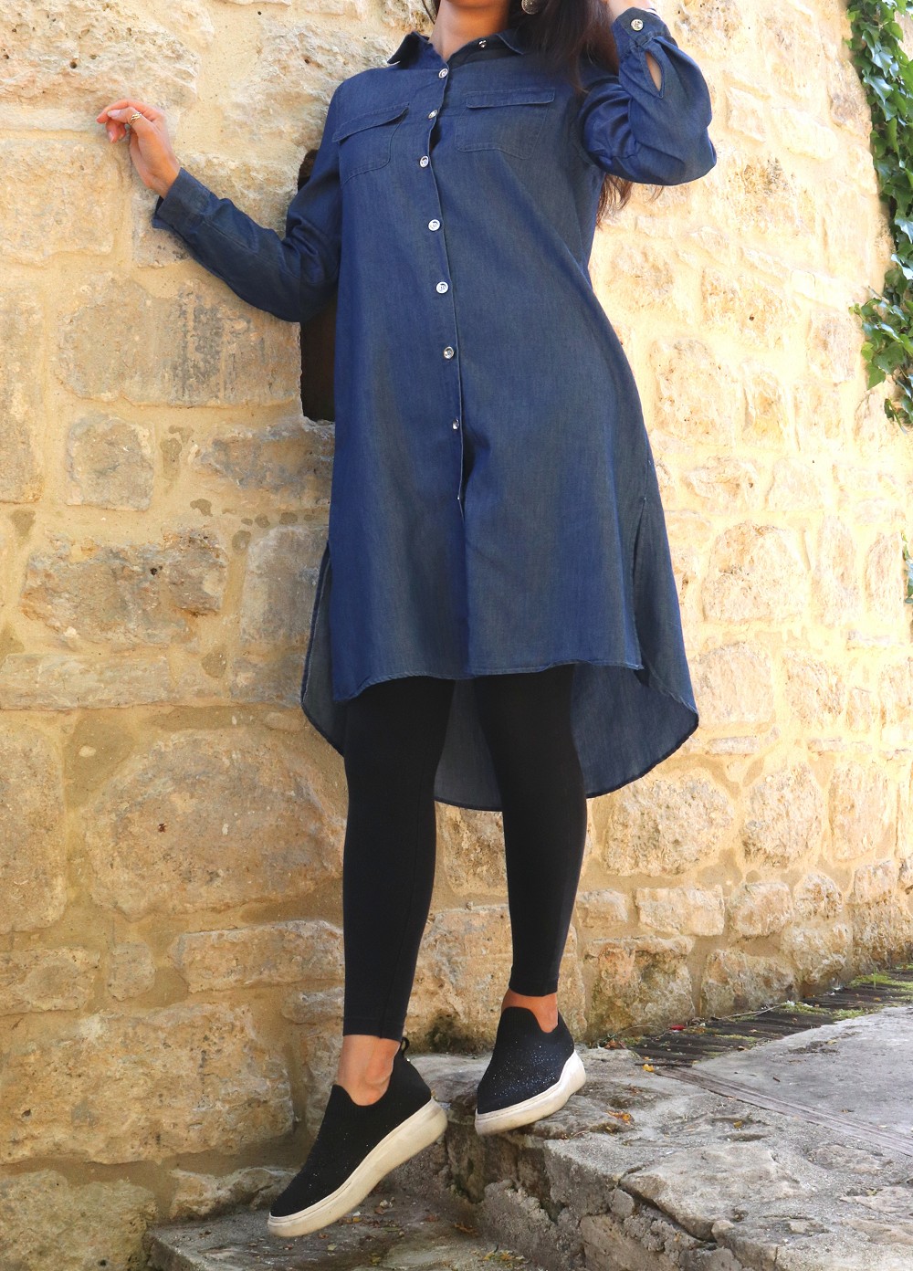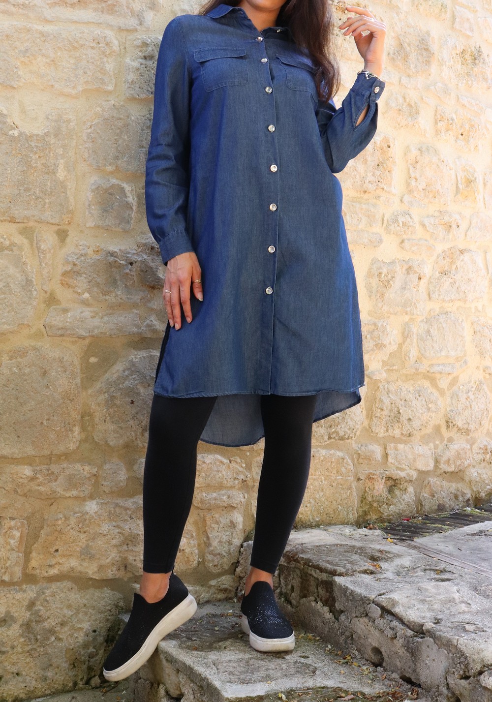 Chemise longue look jean, col classique, manches longues. Coupe décontractée, fermeture frontale par boutons.