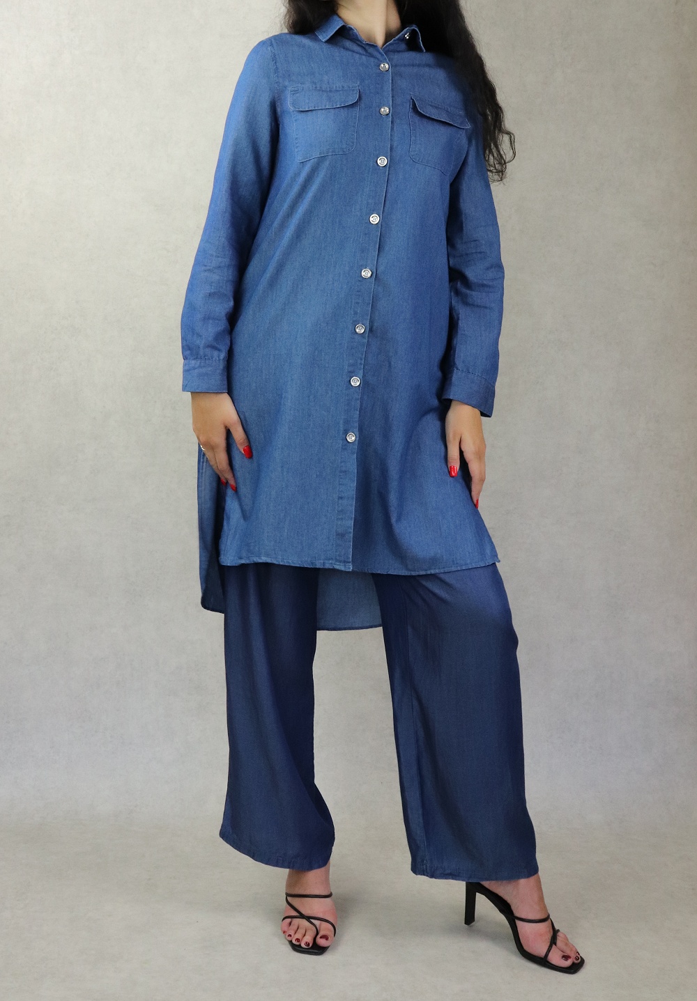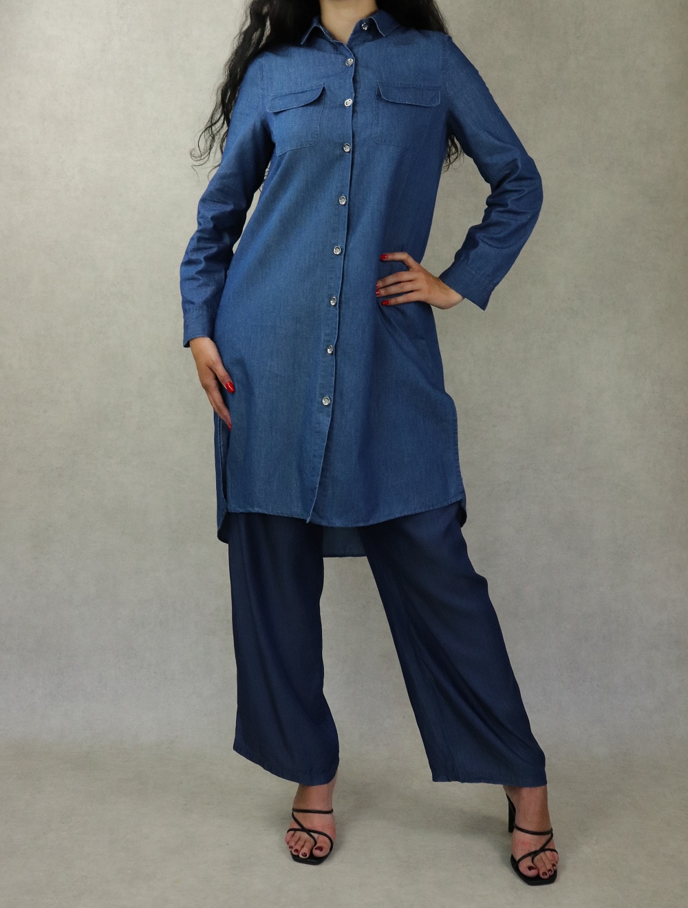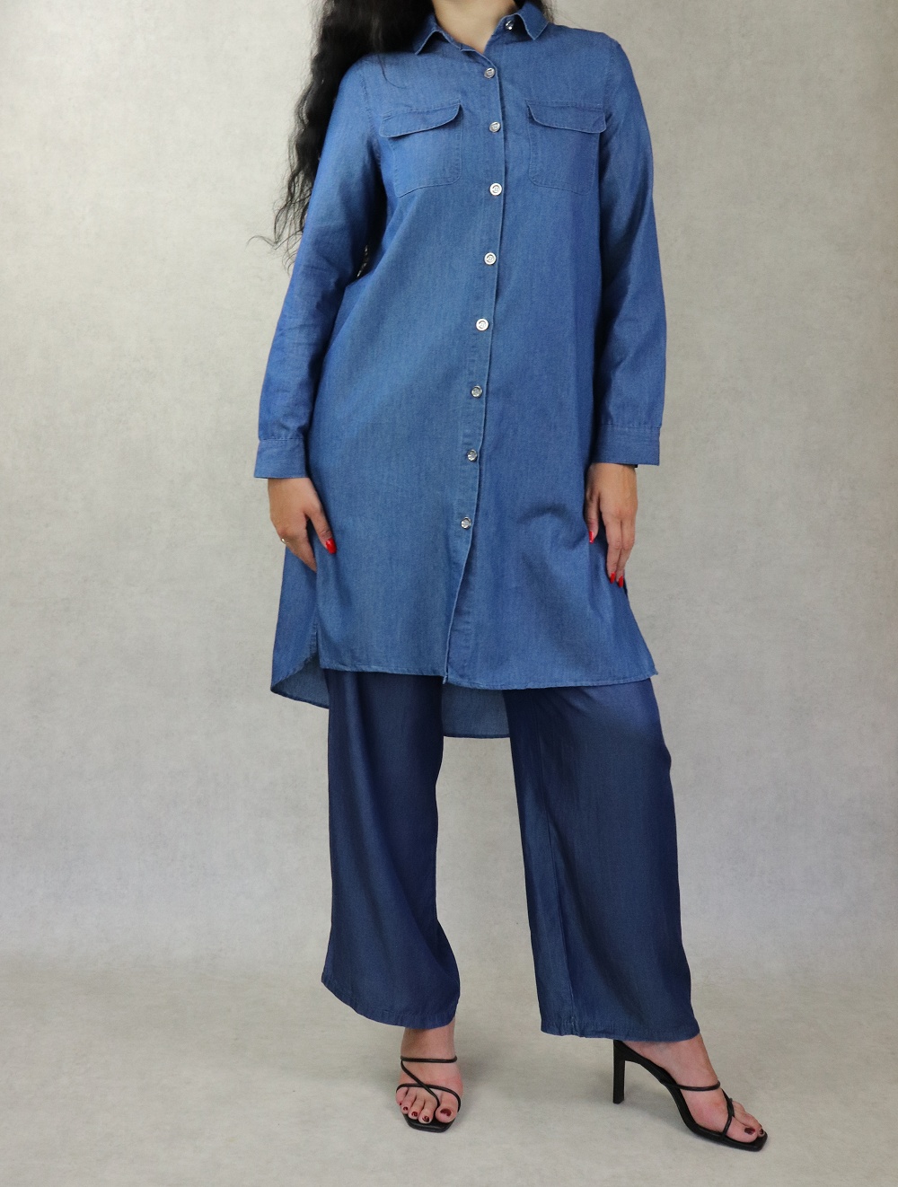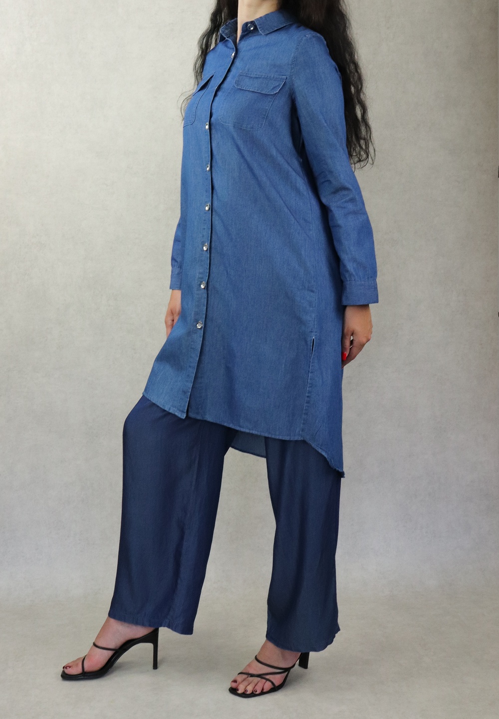 Chemise longue look jean, col classique, manches longues. Coupe décontractée, fermeture frontale par boutons.