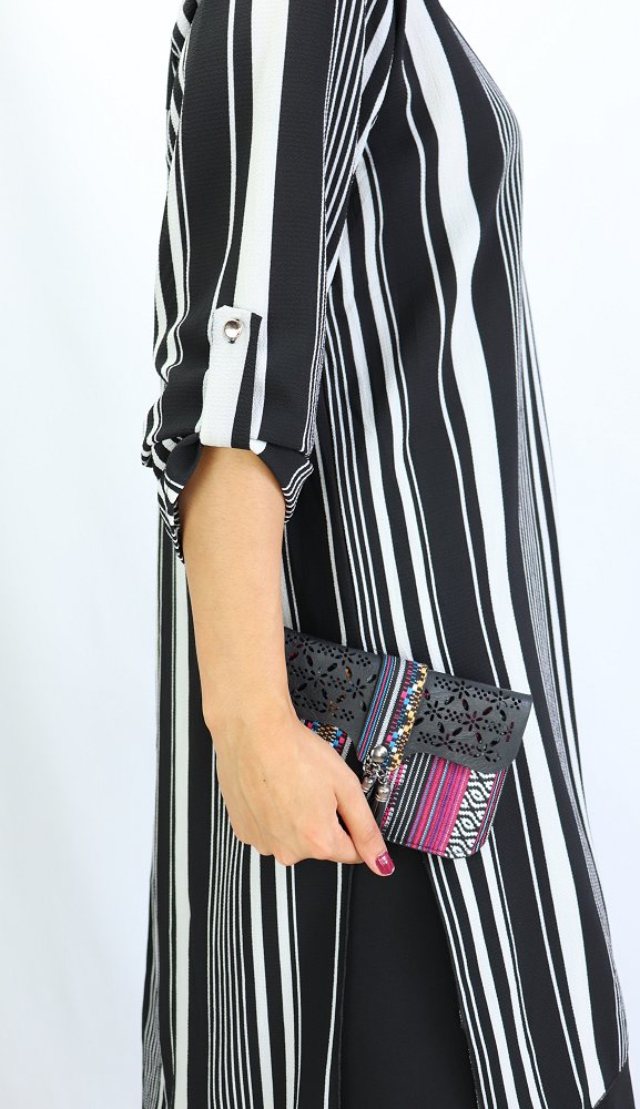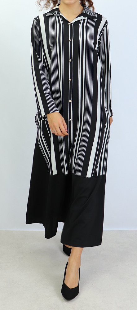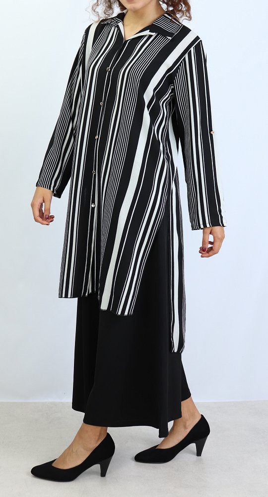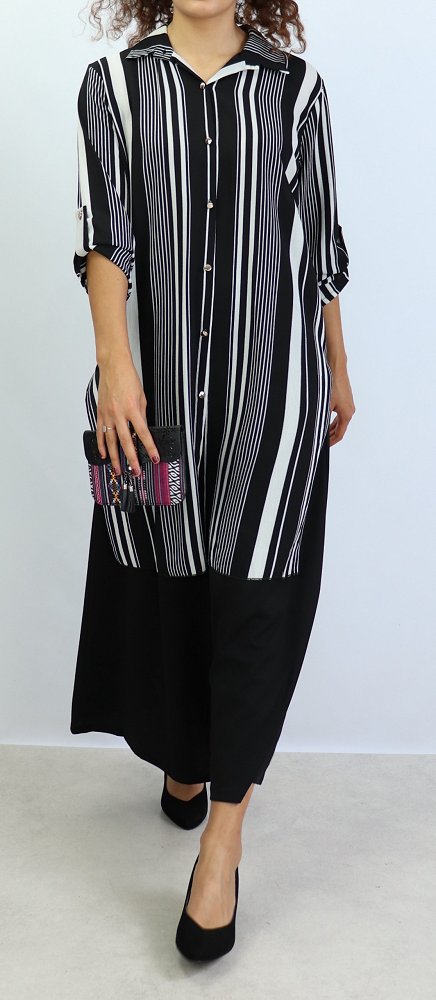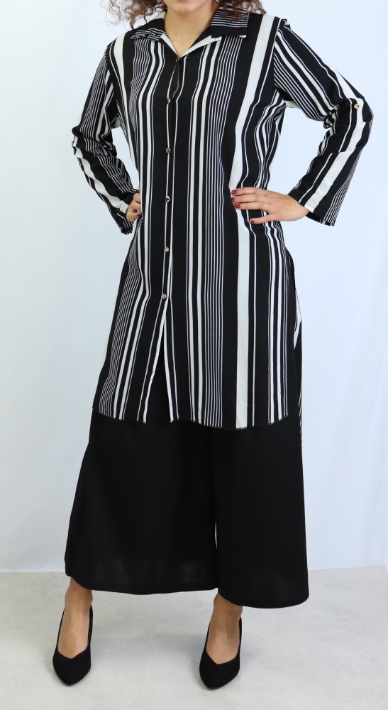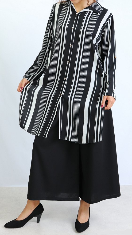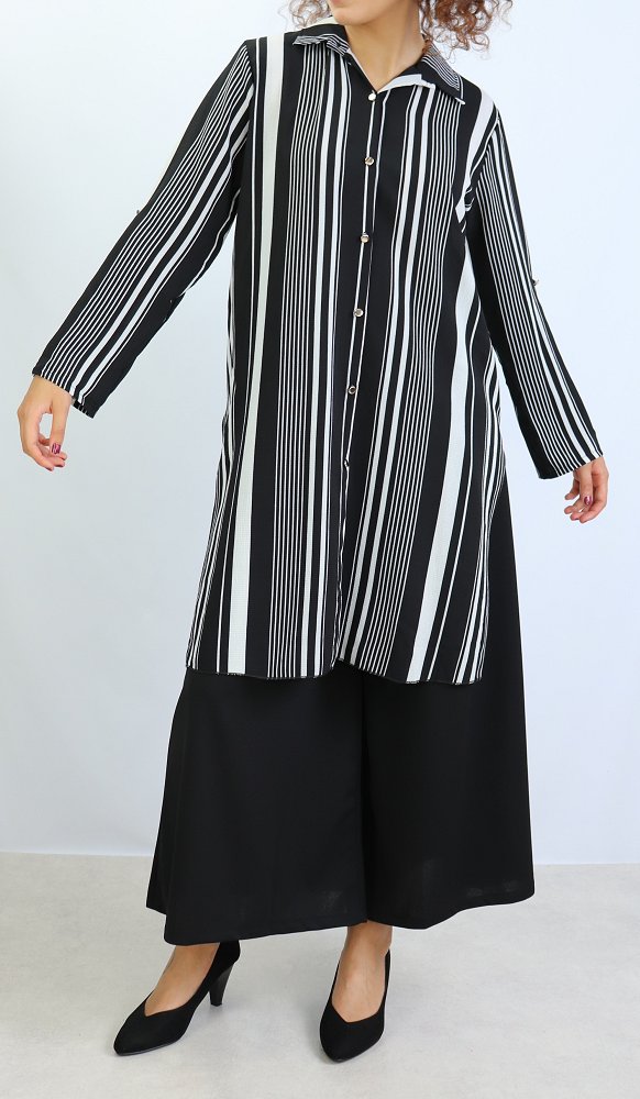 Chemise longue, fermeture boutons, col chemise, les manches sont retroussables et se replient grâce à une patte de boutonnage cousue à l’intérieur.