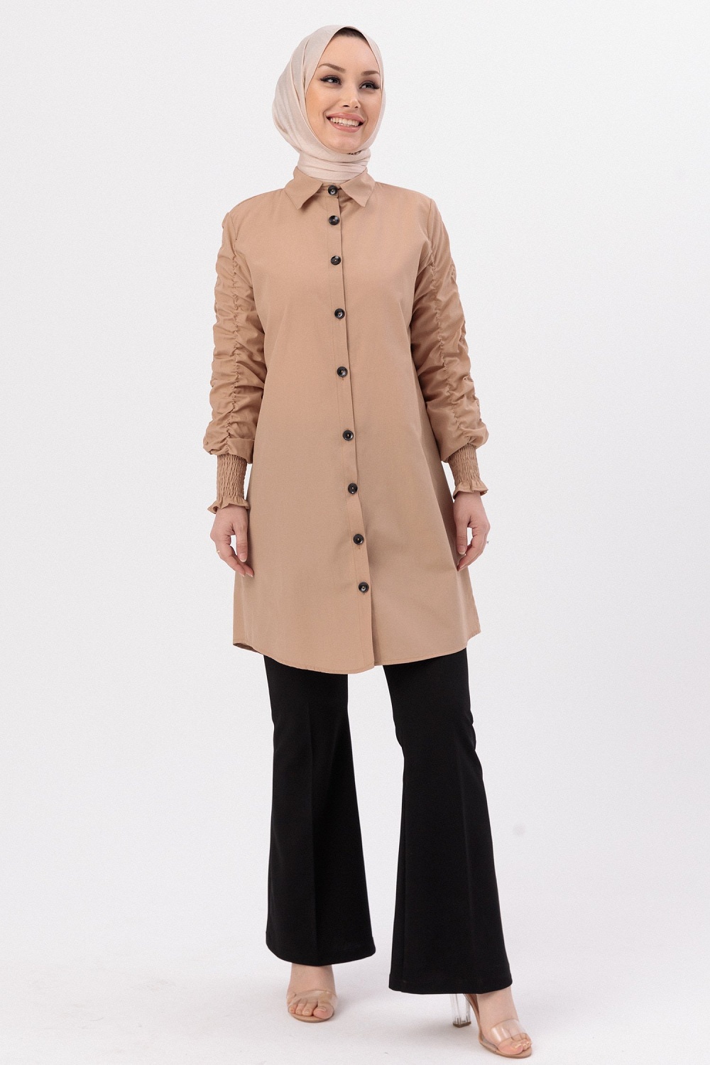 Chemise manches plissées à l'élastique (Vêtement Hijab pour toute l'année) - Couleur beige Vetement & Accessoire