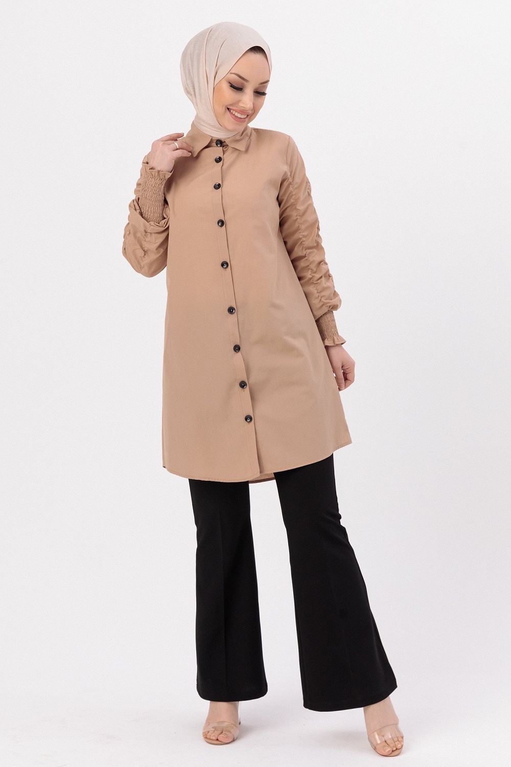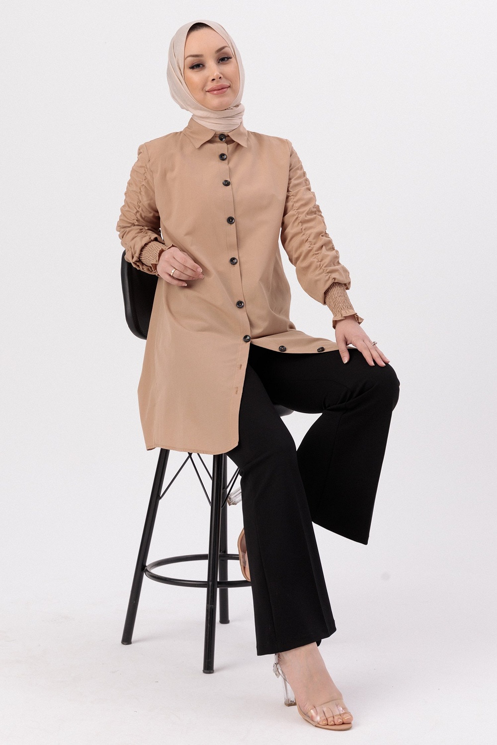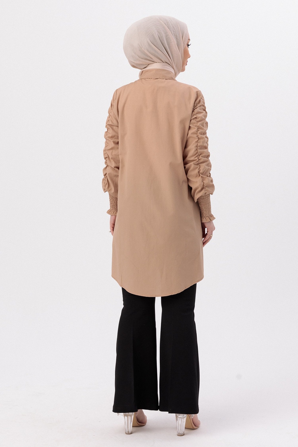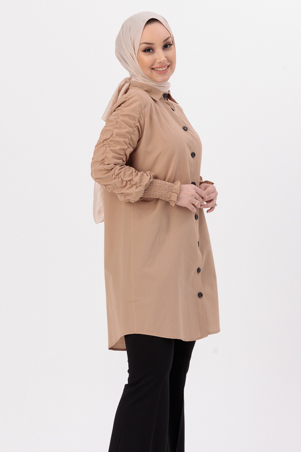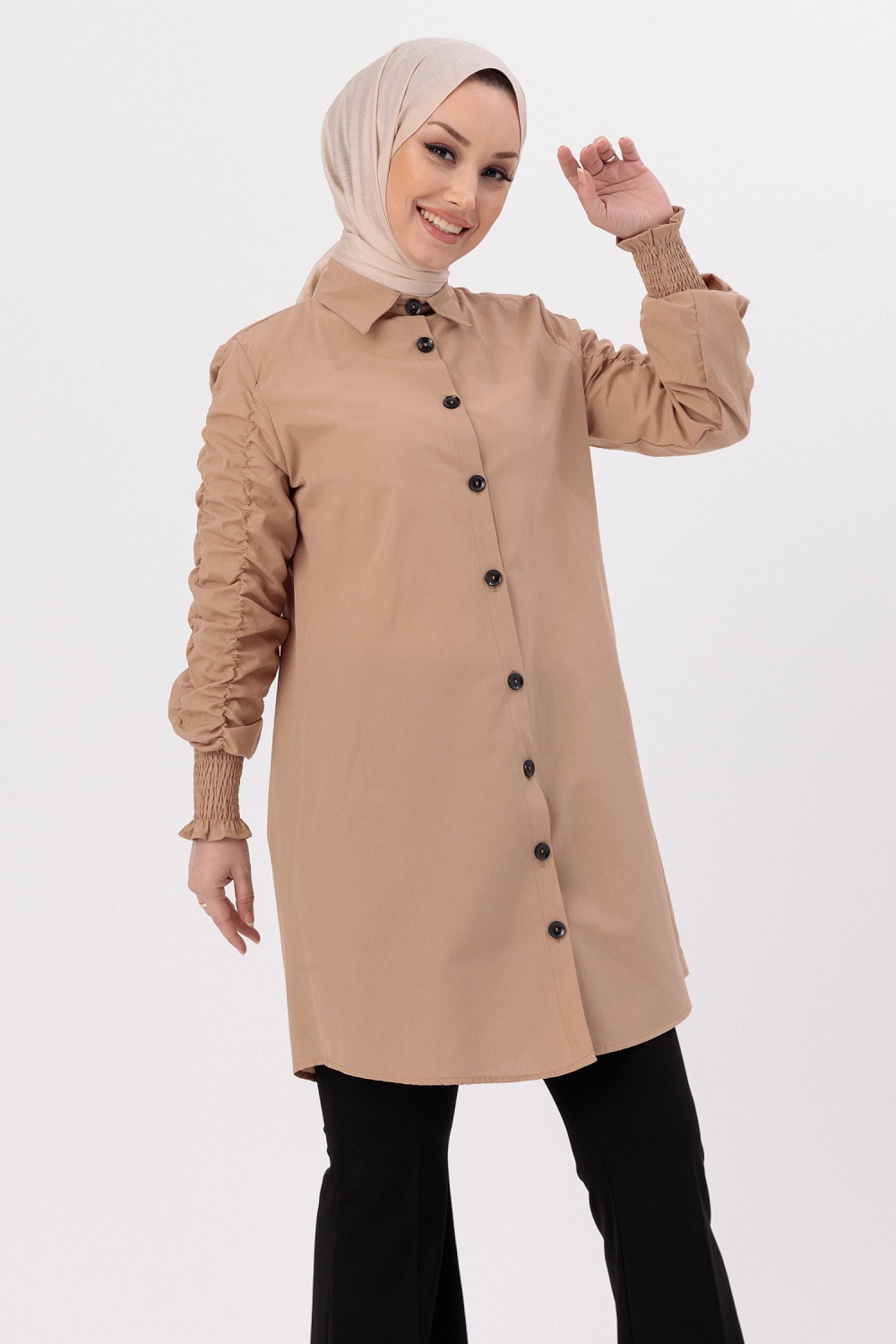 Chemise manches plissees a l'elastique (Vetement Hijab pour toute l'annee) - Couleur beige