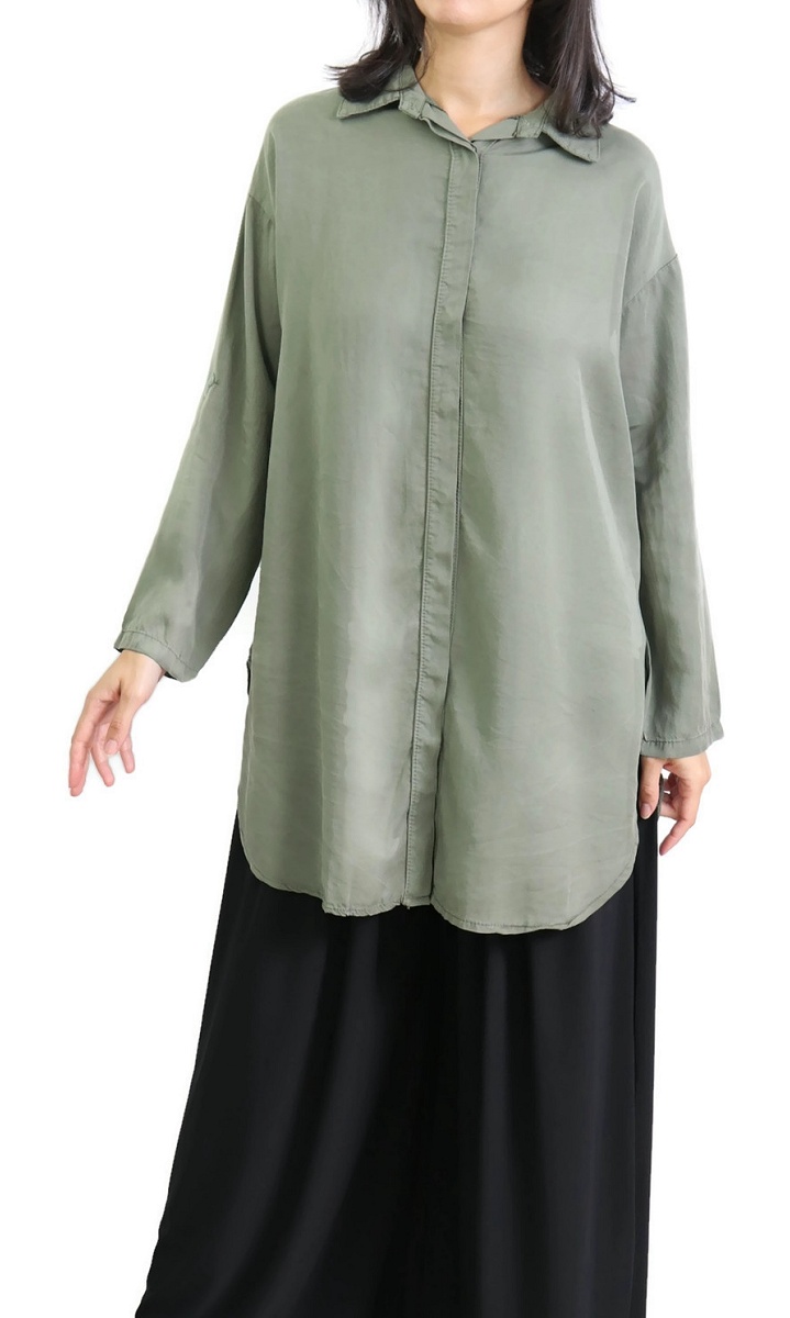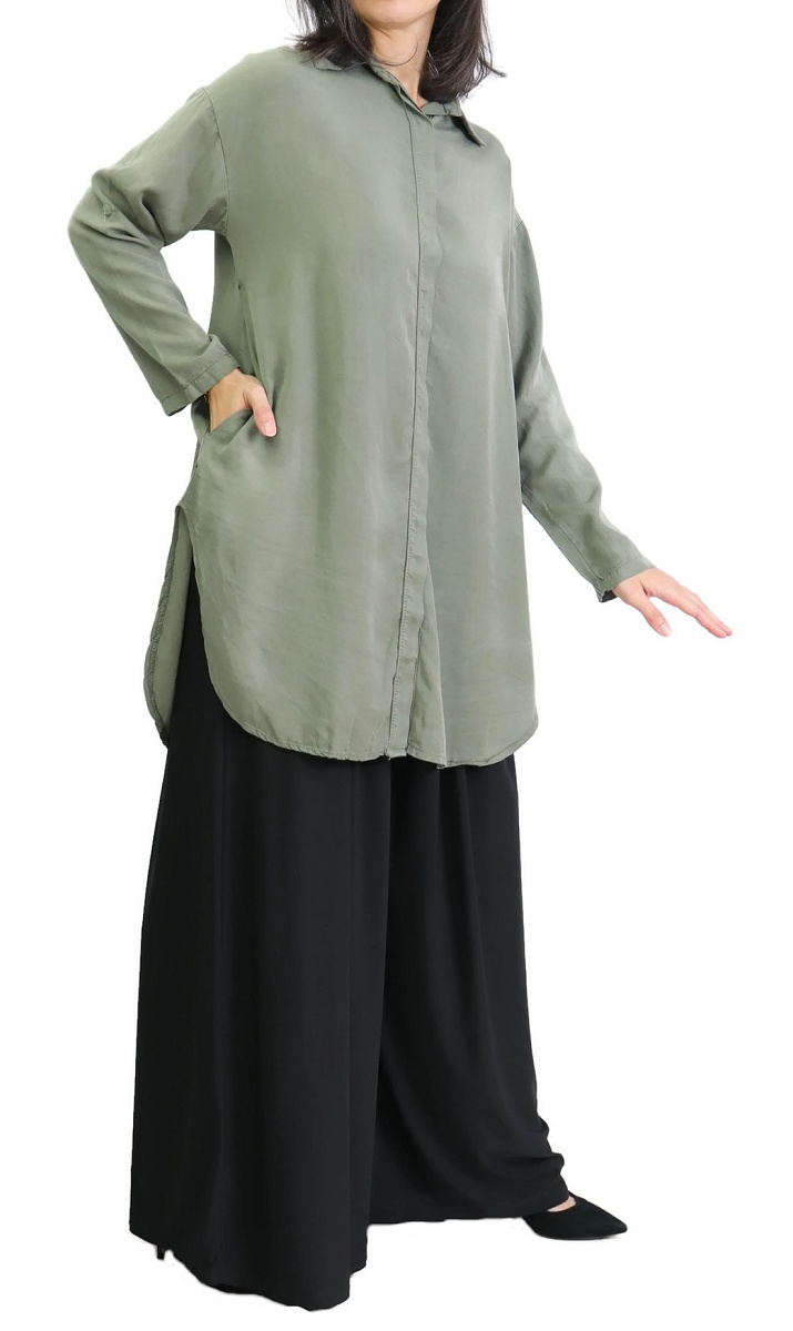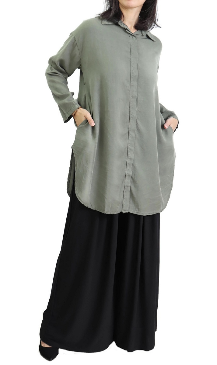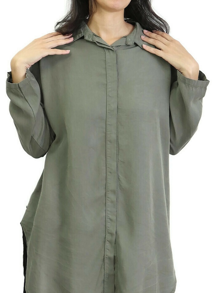 Tunique chemise longue boutonnée tout au long avec cordon pour femme - Couleur kaki - REF. 33569 (25.00 €)