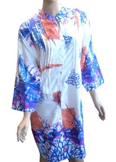 Chemise-tunique blanche a motifs bleus fuchias et corail