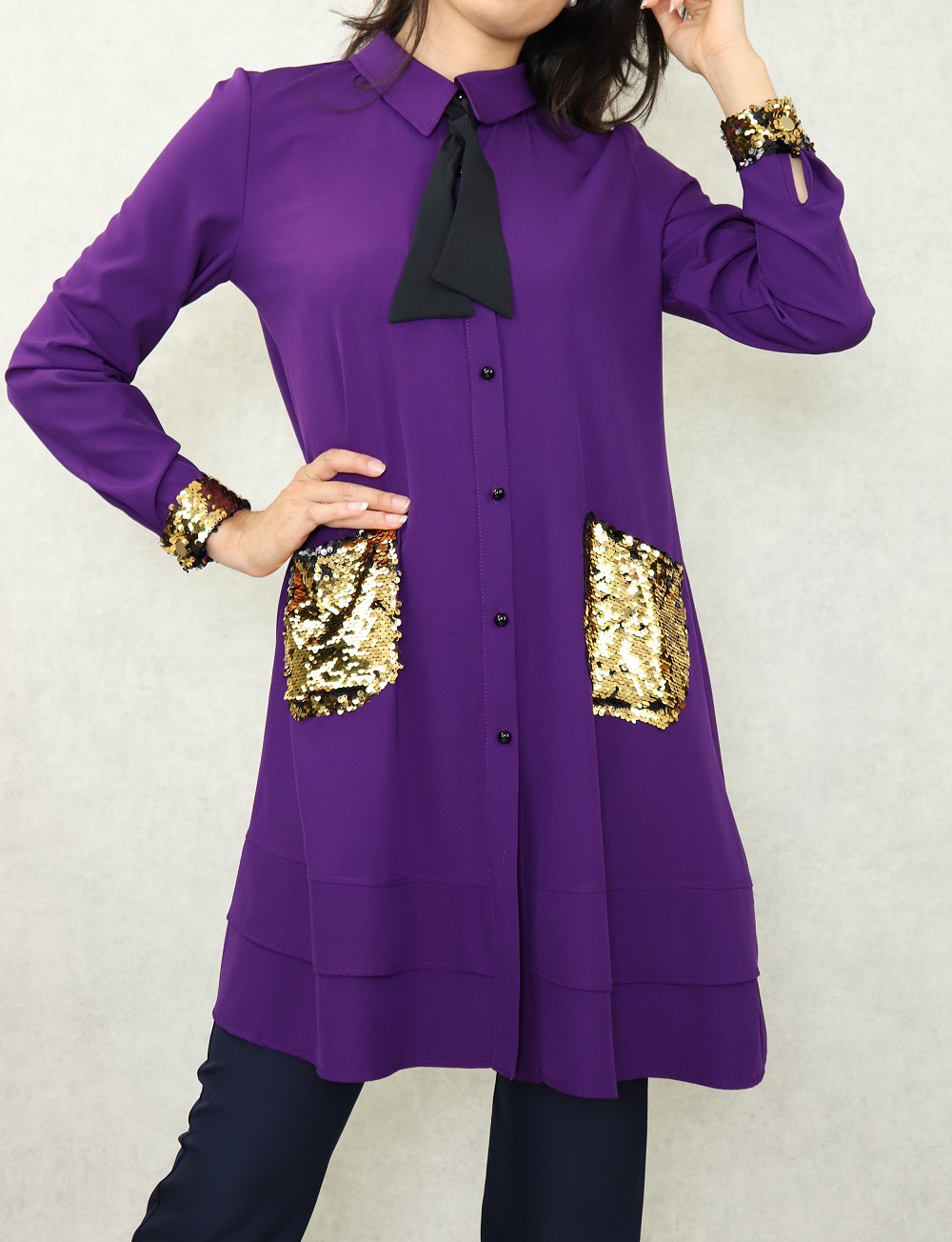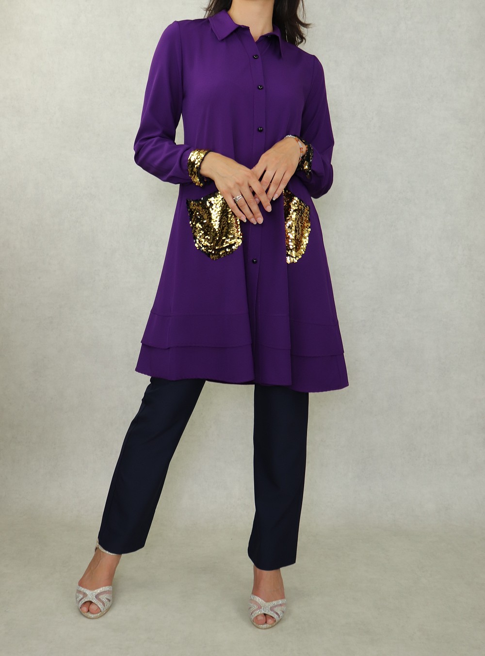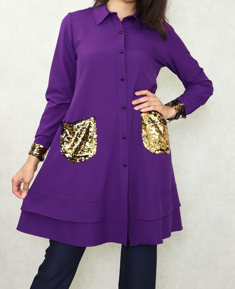Chemise tunique mi-longue avec poches dorees (Plusieurs couleurs disponibles)