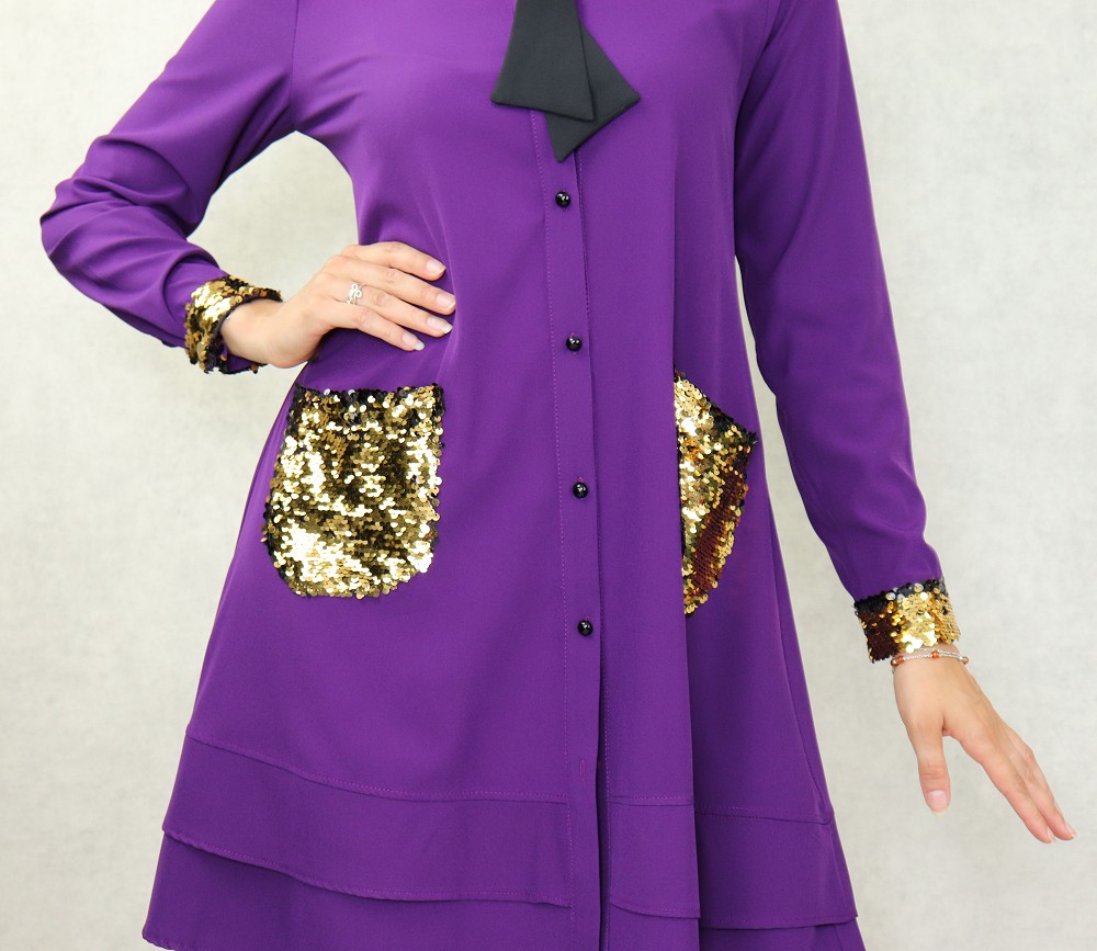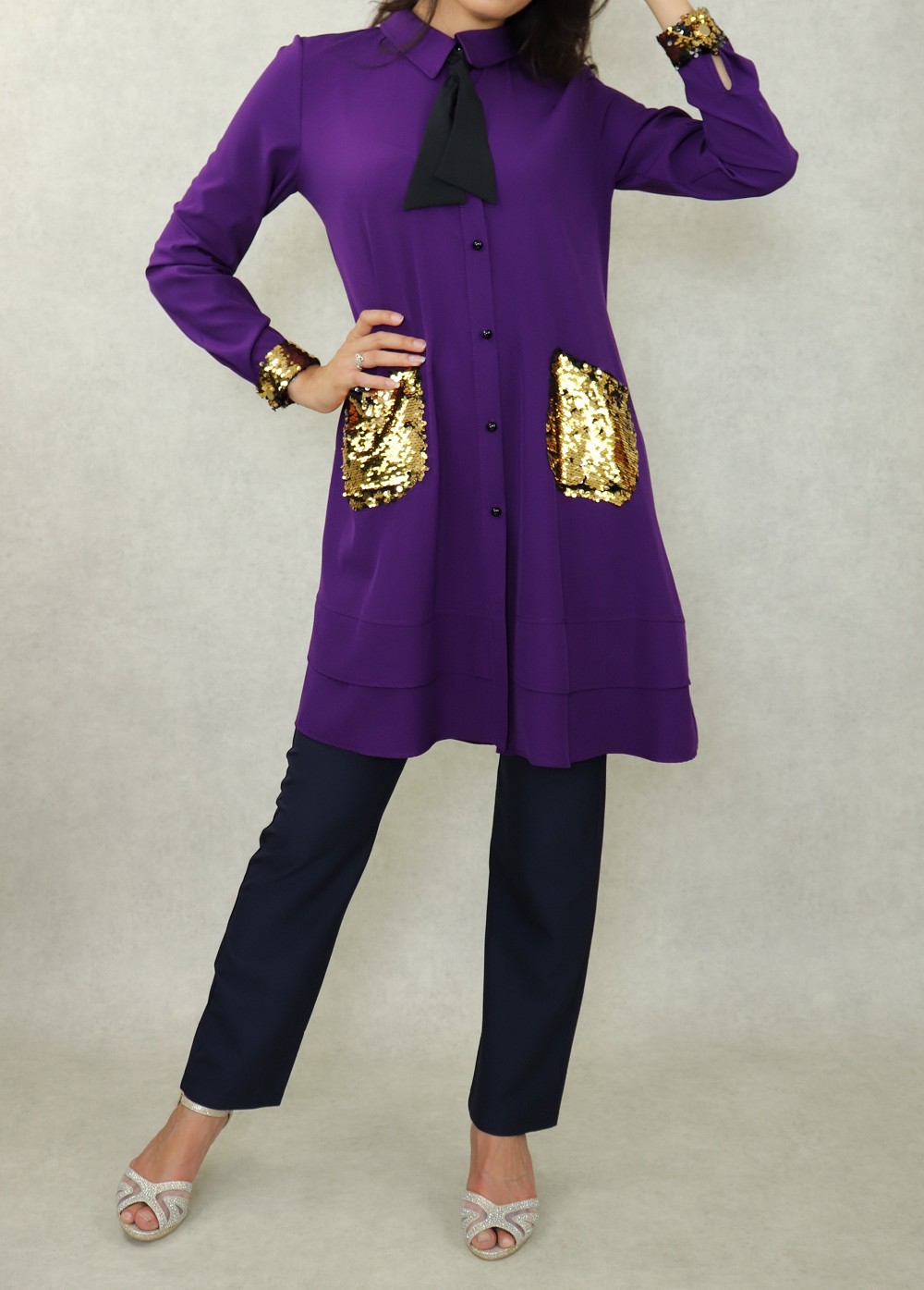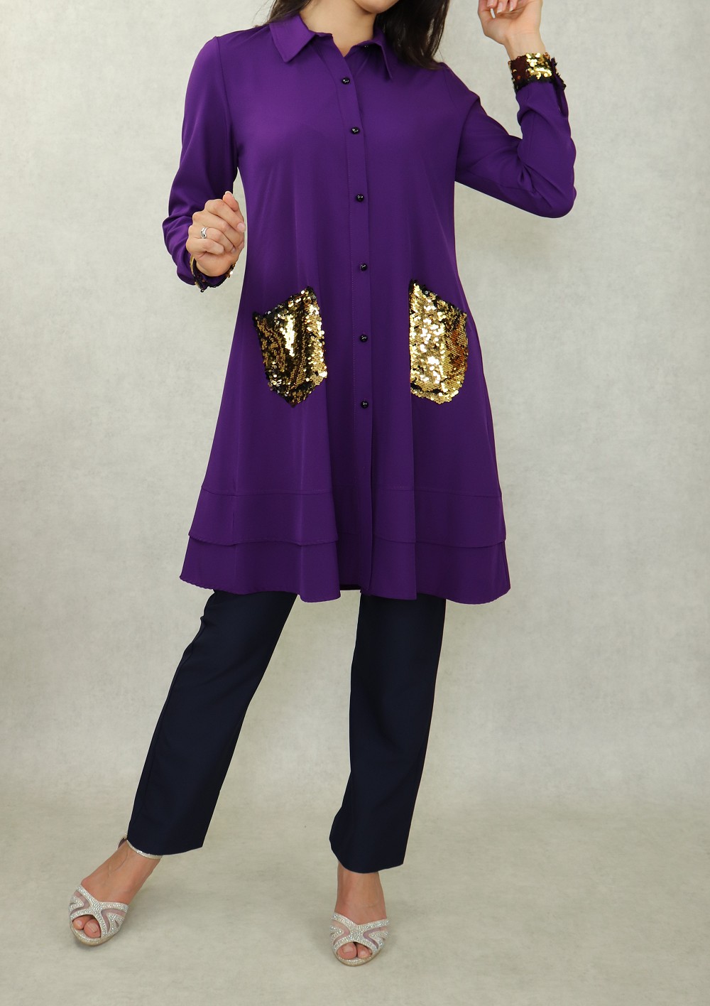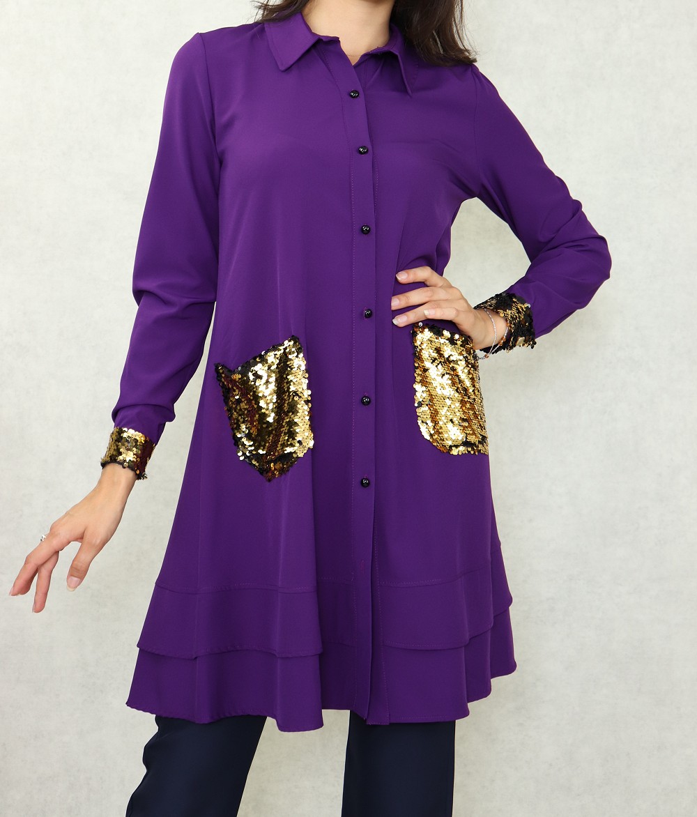 Chemise tunique mi-longue avec poches dorees (Plusieurs couleurs disponibles)