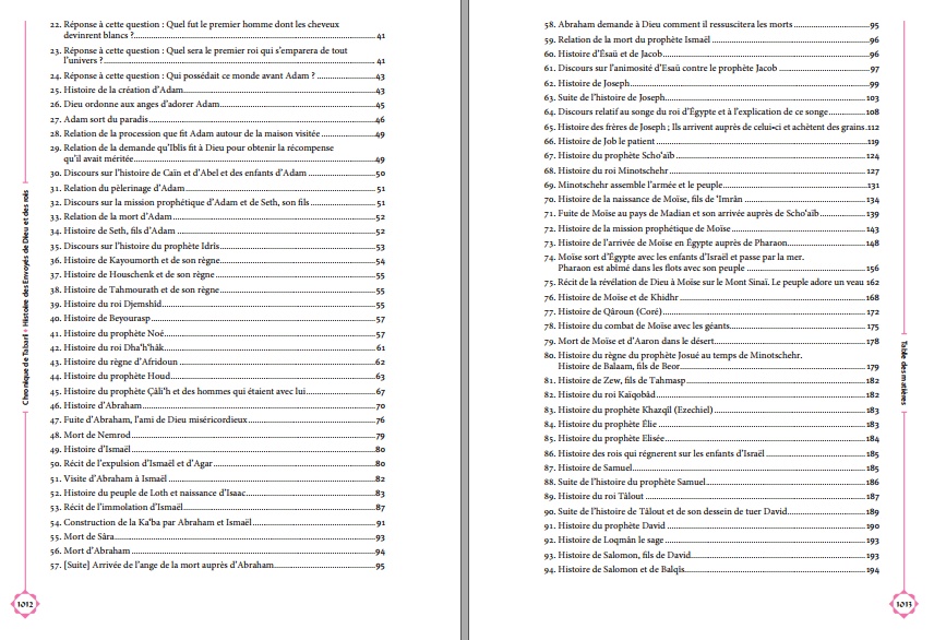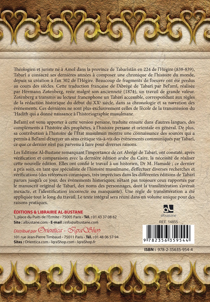 Cette traduction française de l'Abrégé de Tabarî produite par un orientaliste du XIXe siècle et réalisée par Hermann Zotenberg, reste, malgré son ancienneté (1874), un travail de grande valeur. Zotenberg a transmis au lecteur francophone un Tabarî accessible, correspondant aux règles de la rédaction historique du début du XXème siècle, aussi bien dans la chronologie que dans la narration des évènements. Ces règles ne sont pas exclusivement celles de l'école de la transmission du `Hadîth qui a donné naissance à l'historiographie musulmane.