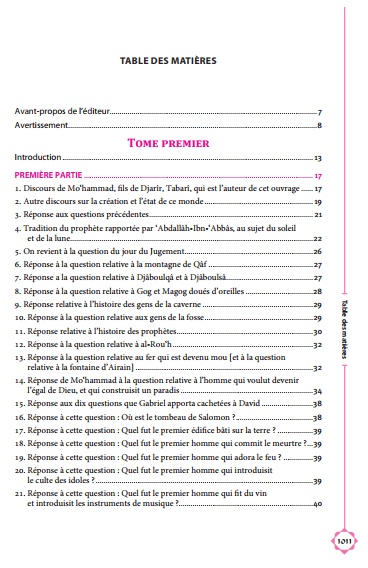 Les Editions Al-Bustane remarquant l'importance de cet Abrégé ont constaté, après vérification et comparaison avec la dernière édition arabe du Caire, la nécessité d'en réaliser une nouvelle. Elles ont confié ce travail à un historien, Dr M. Hamadé qui a pris soin, en tant que spécialiste dans son domaine, de donner des références coraniques, car dans les différentes éditions de Tabarî parues jusqu'alors, les informations étaient très imprécises, les évènements historiques pas toujours ceux rapportés par le manuscrit original, les noms des personnages s'avéraient inexactes. Pour parer à ces erreurs, une règle de translittération a été appliquée. Les interventions ont parfois été mentionnées entre crochets et souvent intégrées directement au coeur du texte afin de ne pas alourdir l'ouvrage initial dont le volume est conséquent. Le texte intégral est compilé dans un volume unique pour des raisons pratiques.