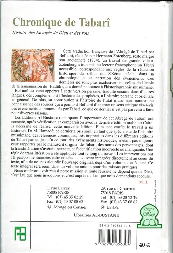 Traduction par un orientaliste du XIXe siècle. Cette traduction française de l'Abrégé de Tabarî par Bel`amî, réalisée par Hermann Zotenberg, reste malgré son ancienneté (1874), un travail de grande valeur. Zotenberg a transmis au lecteur francophone un Tabarî accessible, correspondant aux règles de la rédaction historique du début du XXème siècle, dans sa chronologie et sa narration des évènements. Ces dernières ne sont plus exclusivement celles de l'école de la transmission du `Hadîth qui a donné naissance à l'historiographie musulmane.