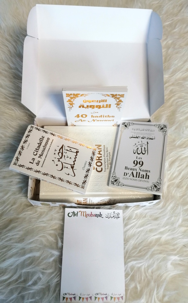 Coffret Cadeau "Aïd Moubarak" avec les livres suivants : Le Saint Coran (français/arabe/phonétique) - La Citadelle du musulman - Les 40 hadiths Nawawi - Les 99 Beaux Noms d'Allah, ainsi qu'une carte de vœux "Aïd Moubarak" assortie sur laquelle vous pourrez marquer un petit mot.