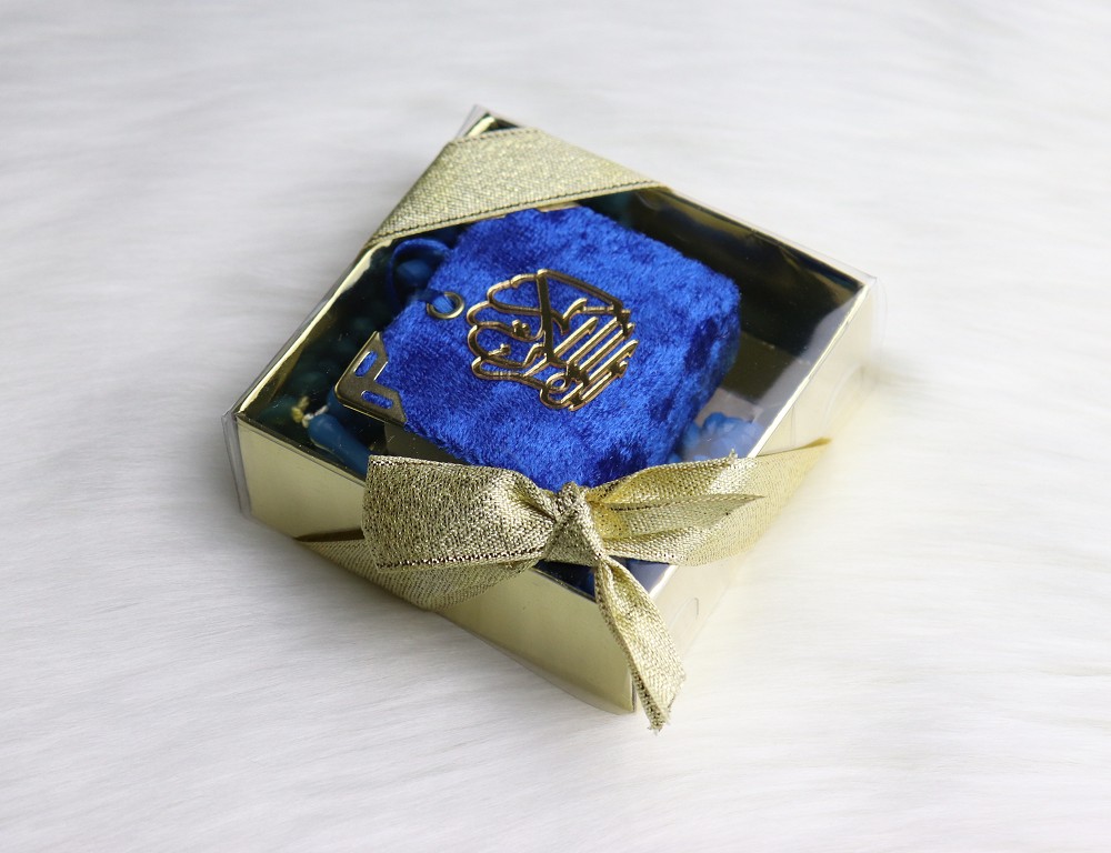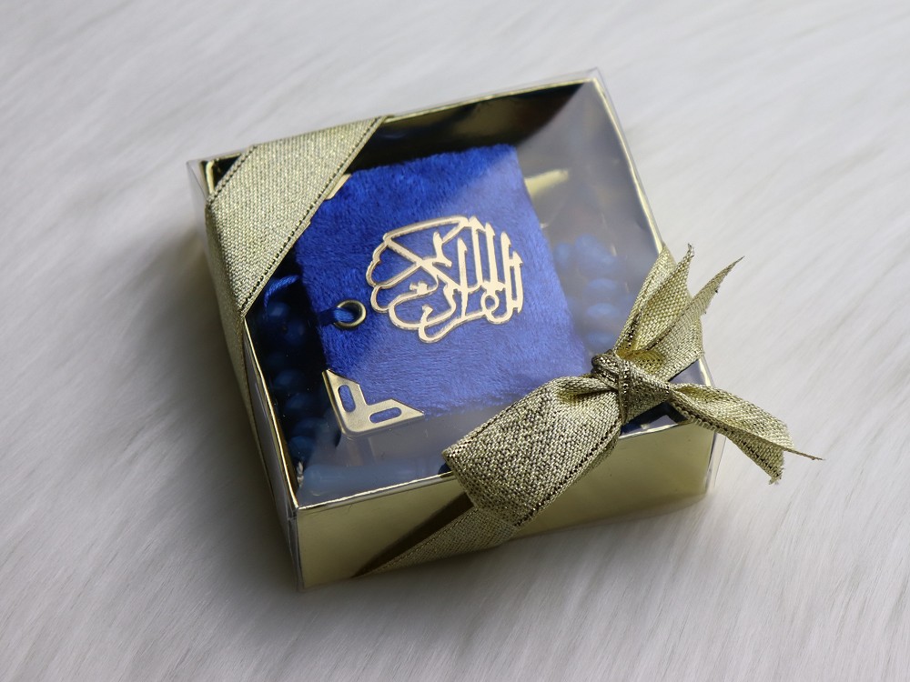 Un mini Coran recouvert de tissu en velours vrillant et un chapelet 99 grains. Le Coran est complet mais écrit en tout petit... Décoration dorée fixée sur le Coran avec la calligraphie "Al Quran Al Karim" (Le Saint Coran).