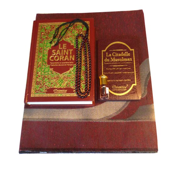 Pack cadeau avec livres : Le Saint Coran & La Citadelle du musulman (bilingues français/arabe) - Tapis marron - Chapelet - Parfum au choix - Tous de couleur noir - REF. 22303 (29.90 €)