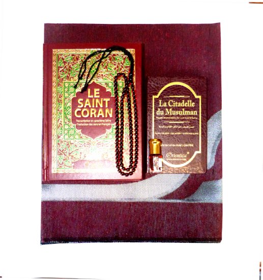 Coffret Cadeau Homme (Bordeaux) : Le Saint Coran Phonétique et La Citadelle du musulman (deux livres français arabe phonétique), Tapis, Musk pour hommes, Chapelet - REF. 22299 (35.00 €)