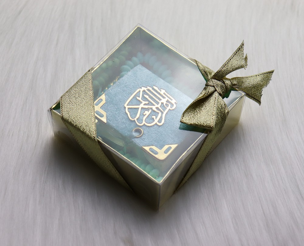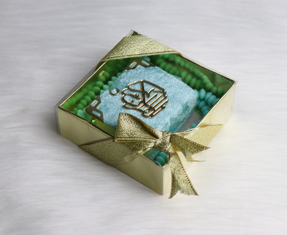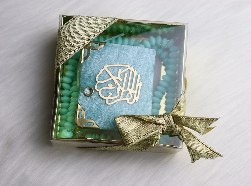 Un mini Coran recouvert de tissu en velours vrillant et un chapelet 99 grains. Le Coran est complet mais écrit en tout petit... Décoration dorée fixée sur le Coran avec la calligraphie "Al Quran Al Karim" (Le Saint Coran).