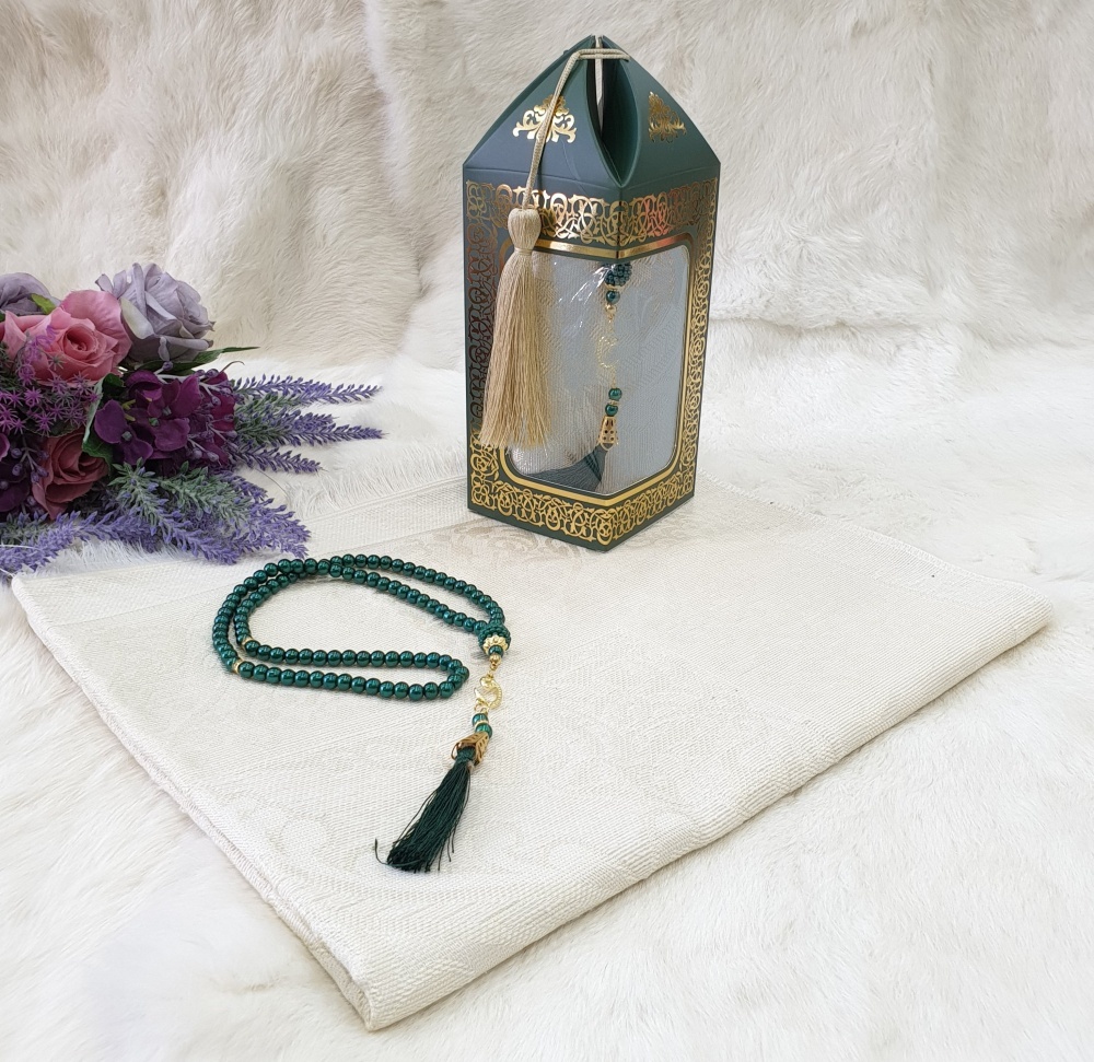 Coffret Cadeau Musulman doré : Tapis décoré brillant et Chapelet (Sebha) - Couleur Vert Deco & Cadeau