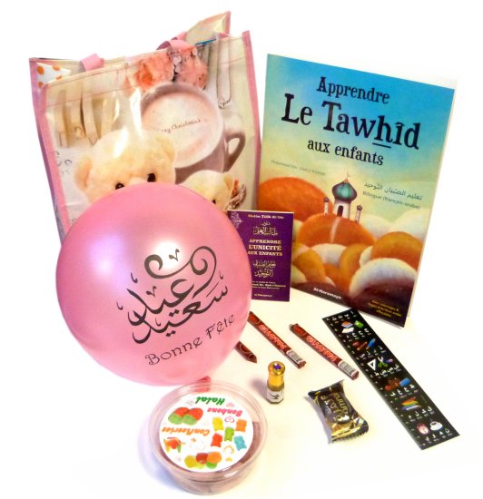 Pack Cadeau Fillette musulmane (3-5 ans) : Nounours - Livres - Bonbons Halal - Musc - Tapis de prière... - REF. 30160 (25.00 €)