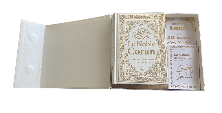 • Le Noble Coran (complet) bilingue arabe-français avec une couverture en cuir blanc doré (Format : 15,5 x 21,5 cm).