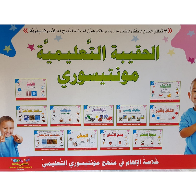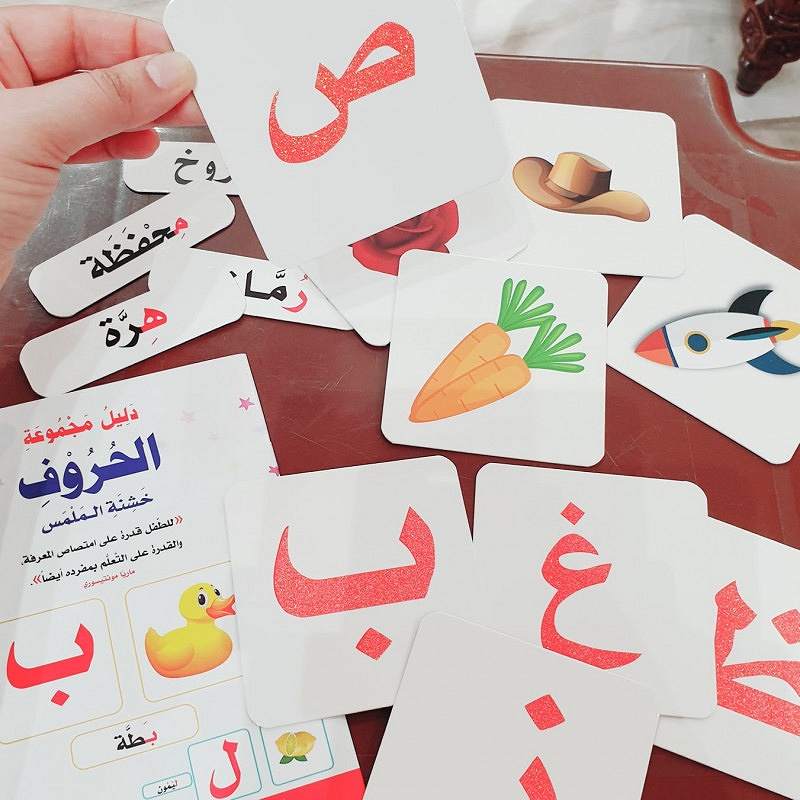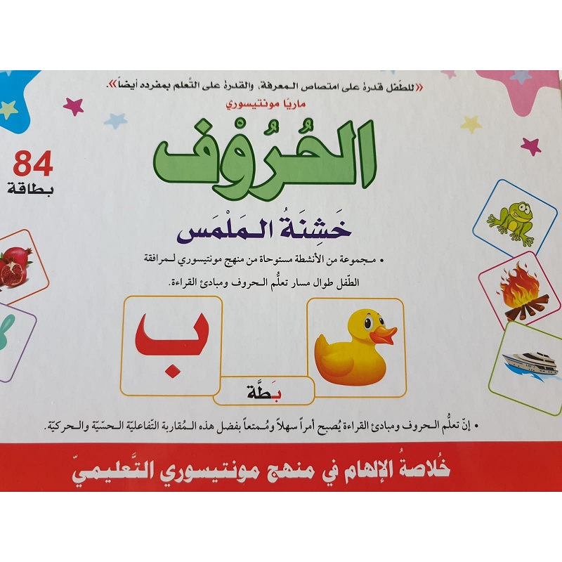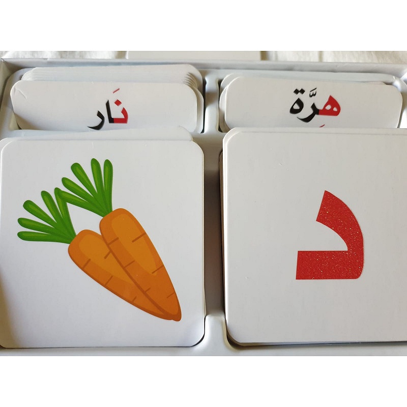 Coffret Montessori spécial "lettres arabes" composé de 84 cartes pour apprendre les lettres et la lecture de manière naturelle.