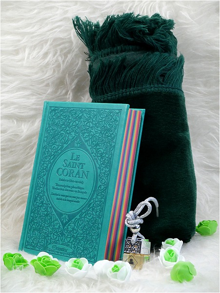 Coffret/Pack Cadeau Bleu : Le Saint Coran Rainbow (français/arabe/phonétique), Tapis de prière et Diffuseur de parfum