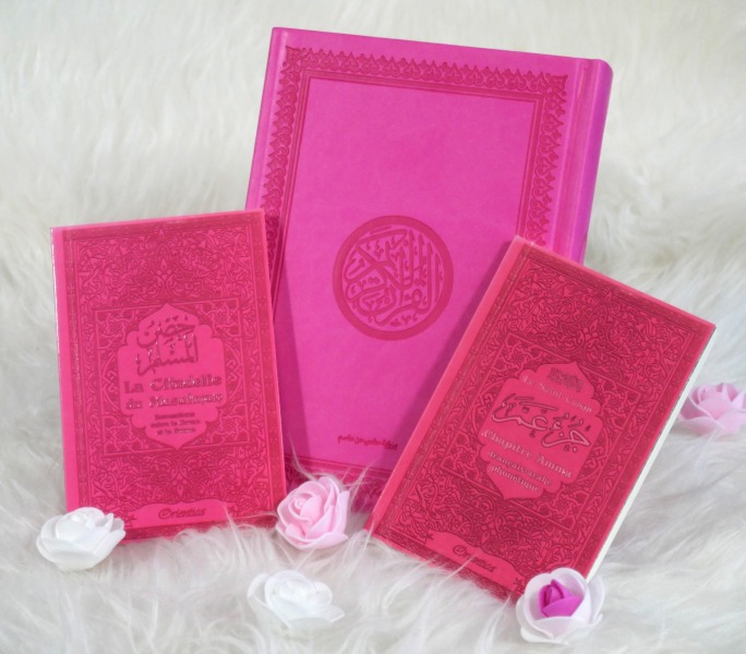 Pack cadeau rose pour femmes : Le Saint Coran (français/arabe/phonétique) + La Citadelle du Musulman + Porte coran (assortis) - REF. 23550 (35.00 €)