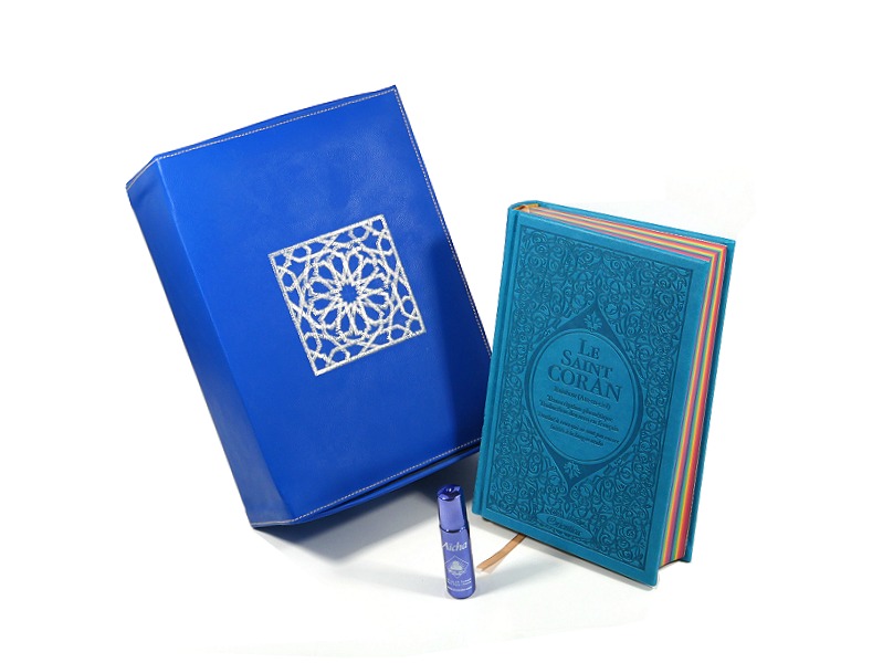 Coffret/Pack Cadeau en cuir bleu : Le Saint Coran Rainbow (francais/arabe/phonetique), Coffret artisanal de luxe et parfum