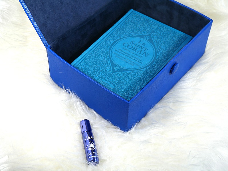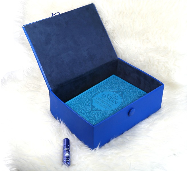 Coffret/Pack Cadeau en cuir bleu : Le Saint Coran Rainbow (français/arabe/phonétique), Coffret artisanal de luxe et parfum Deco & Cadeau Coup de coeur