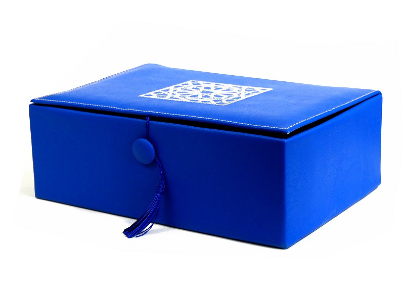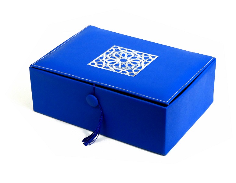 Coffret artisanal de luxe bleu en cuir avec motifs rosace argente