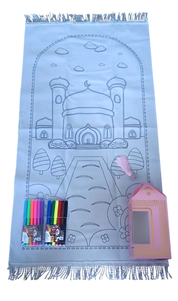 Coffret cadeau pour fille musulmane : Tapis de priere avec 12 feutres de coloriage textile - Boite de couleur rose