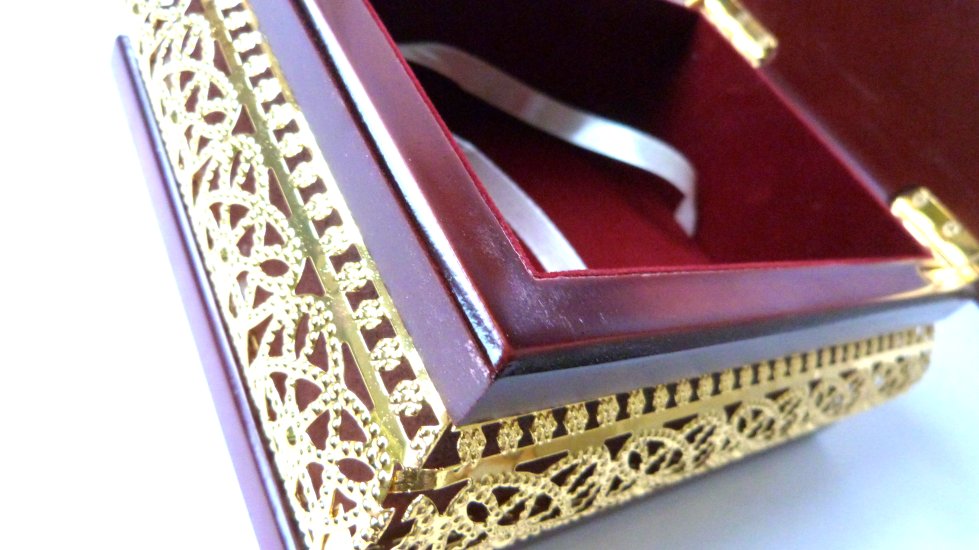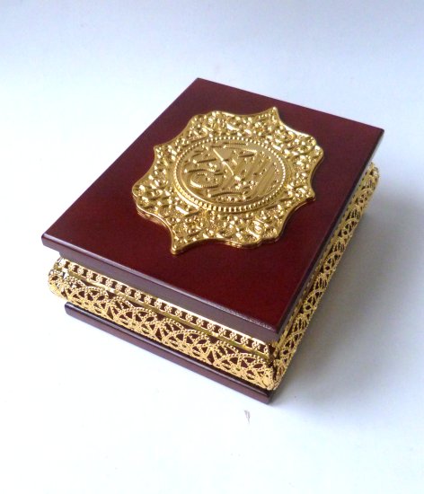 Et quoi de mieux que ce magnifique coffret avec inscription en calligraphie métallique dorée "Al-Qur'ân Al Karîm" (Le Saint Coran) en arabe et avec décoration sur les côtés avec des motifs mordorés. C'est le cadeau rêvé !