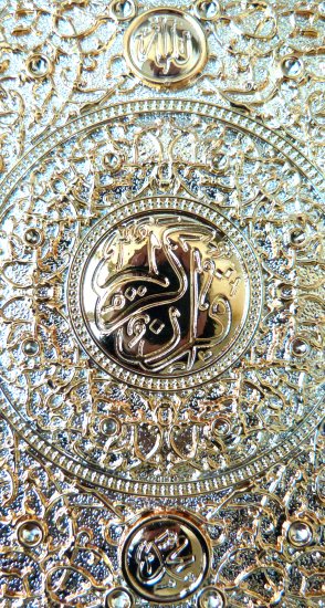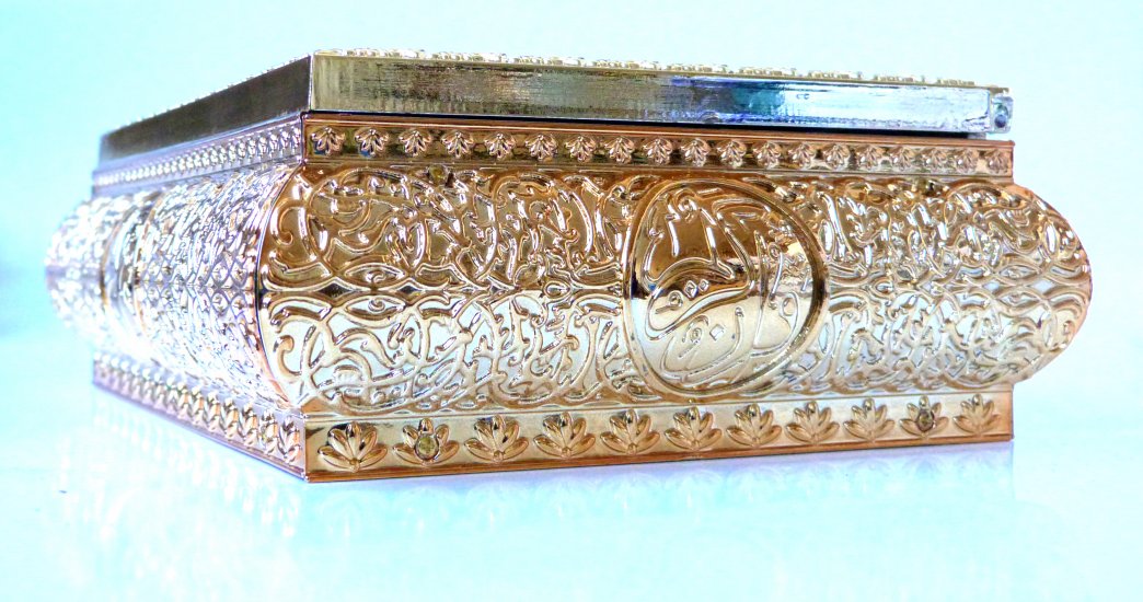 Magnifique coffret métallique doré avec de très jolies décorations, il est inscrit au centre en arabe القرآن الكريم "Le Saint Coran" en haut "Allah" et en bas "Mohammed" (SAW).